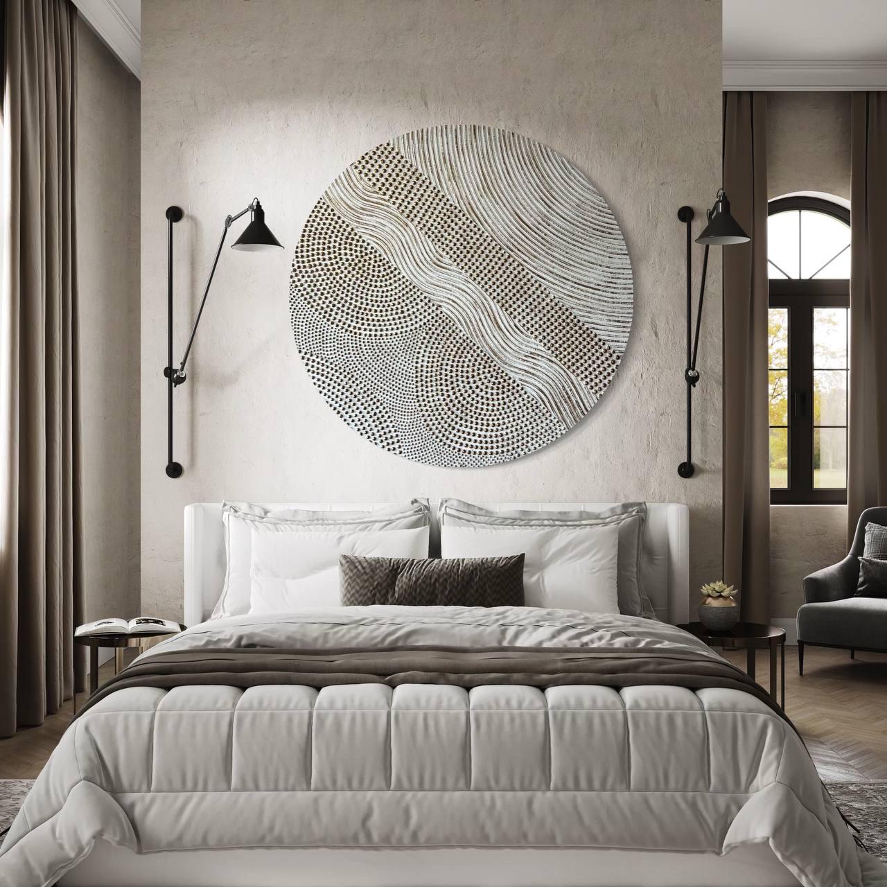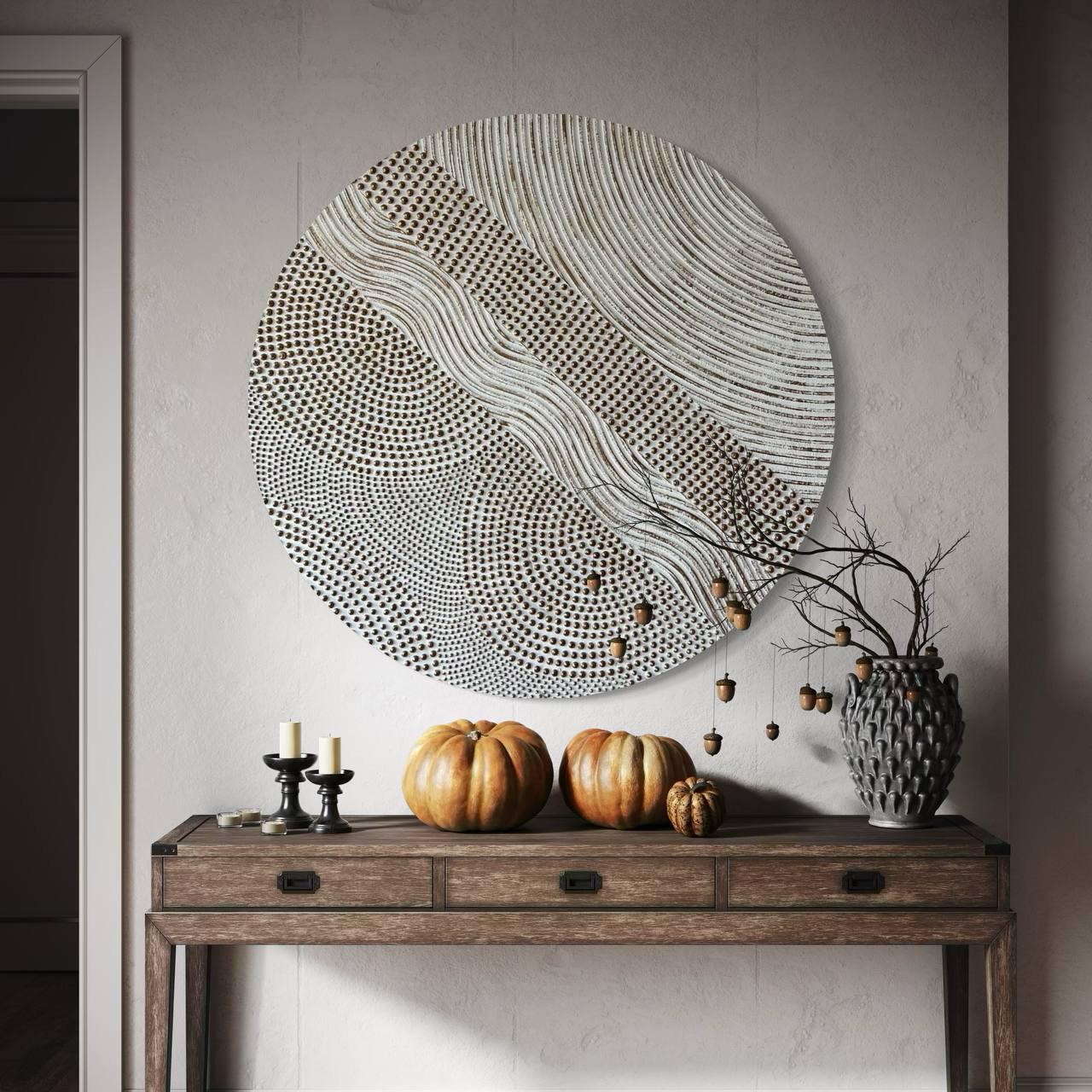 Handmade round 3D textured wall art created with plaster and sculptural techniques.