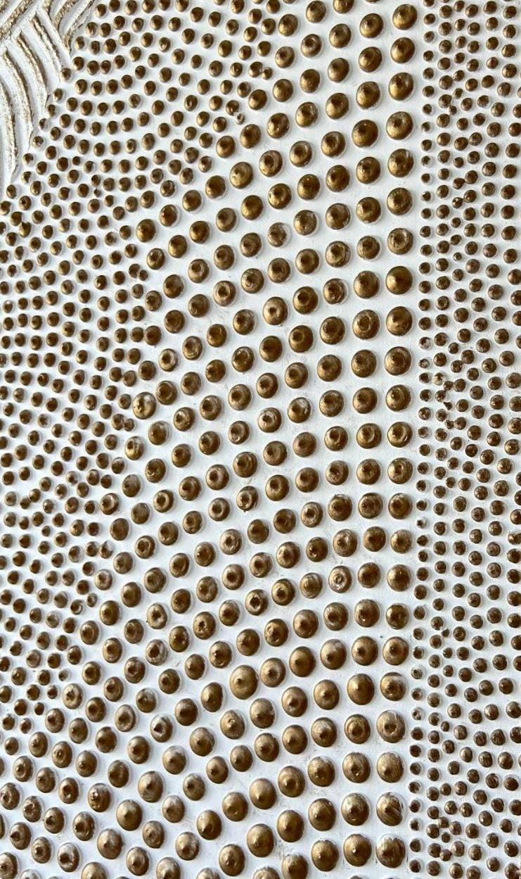 This abstract circular artwork features raised dot textures and flowing relief patterns, creating depth, shadow, and a strong tactile presence.