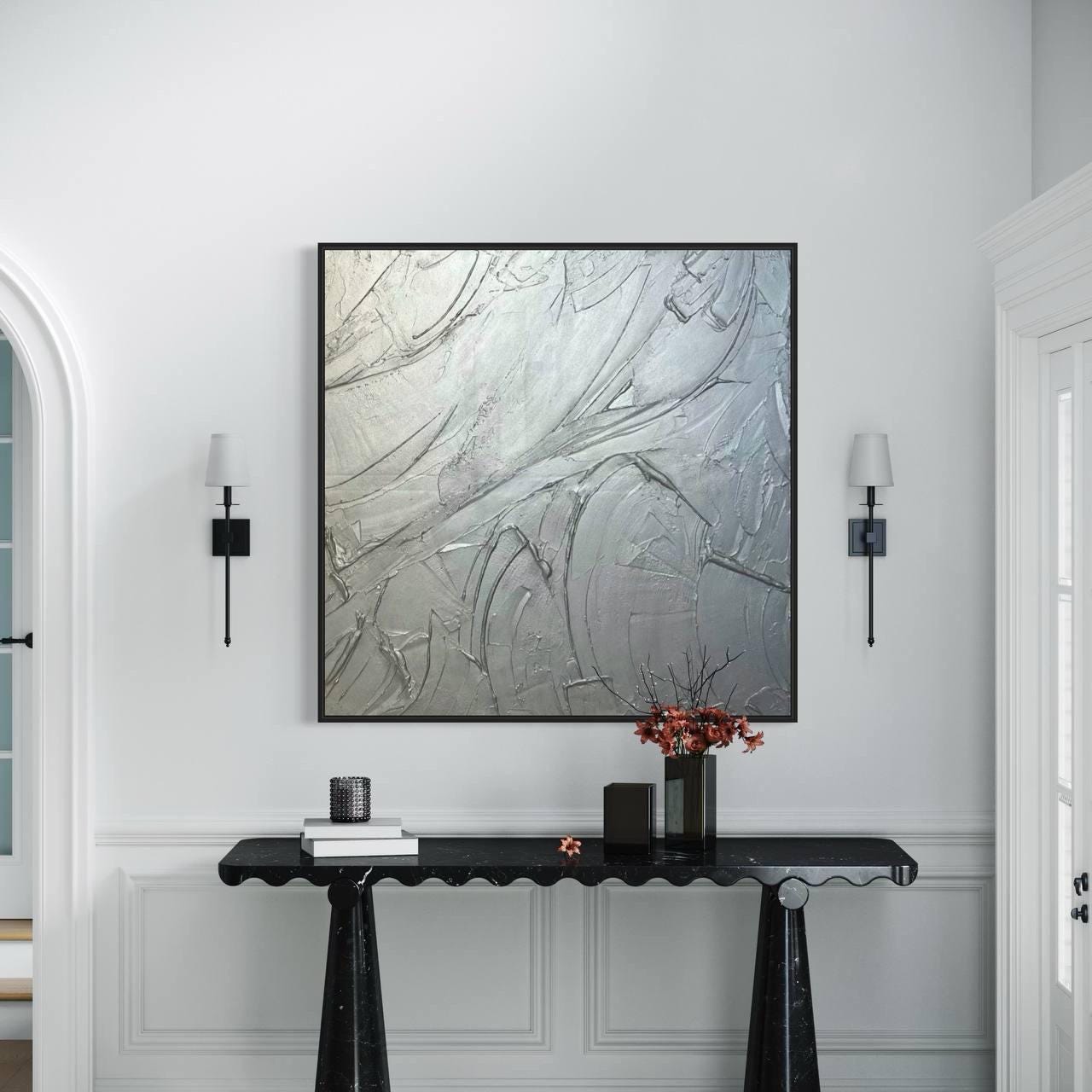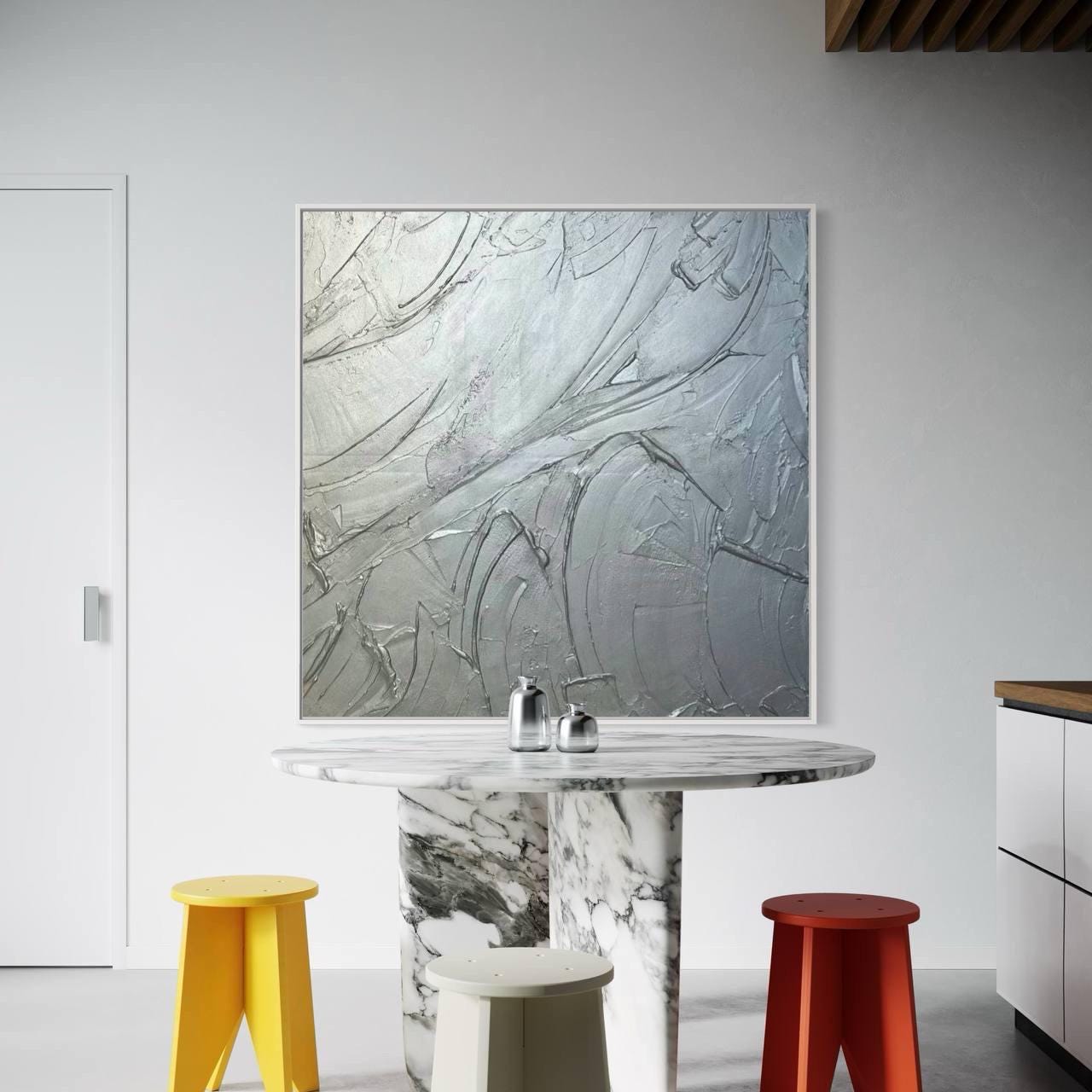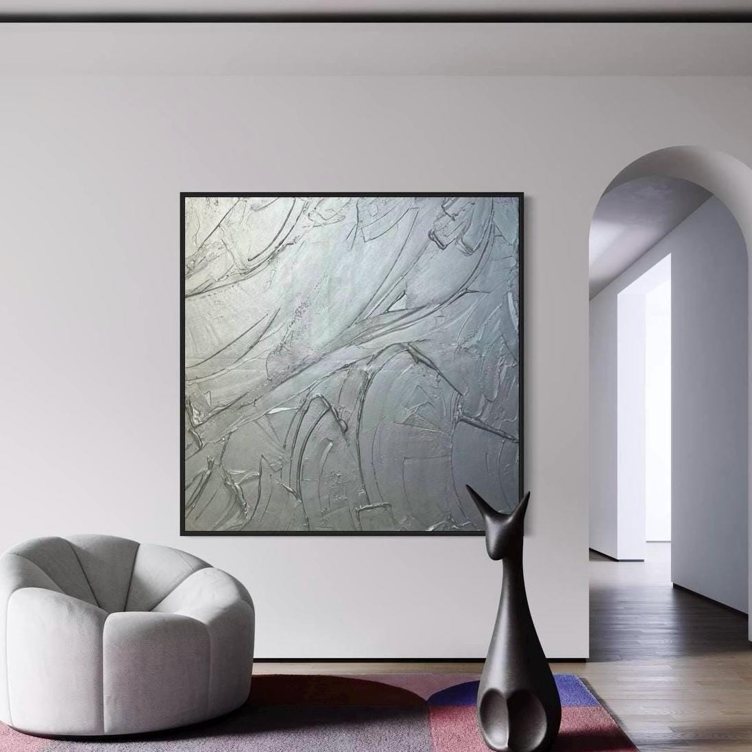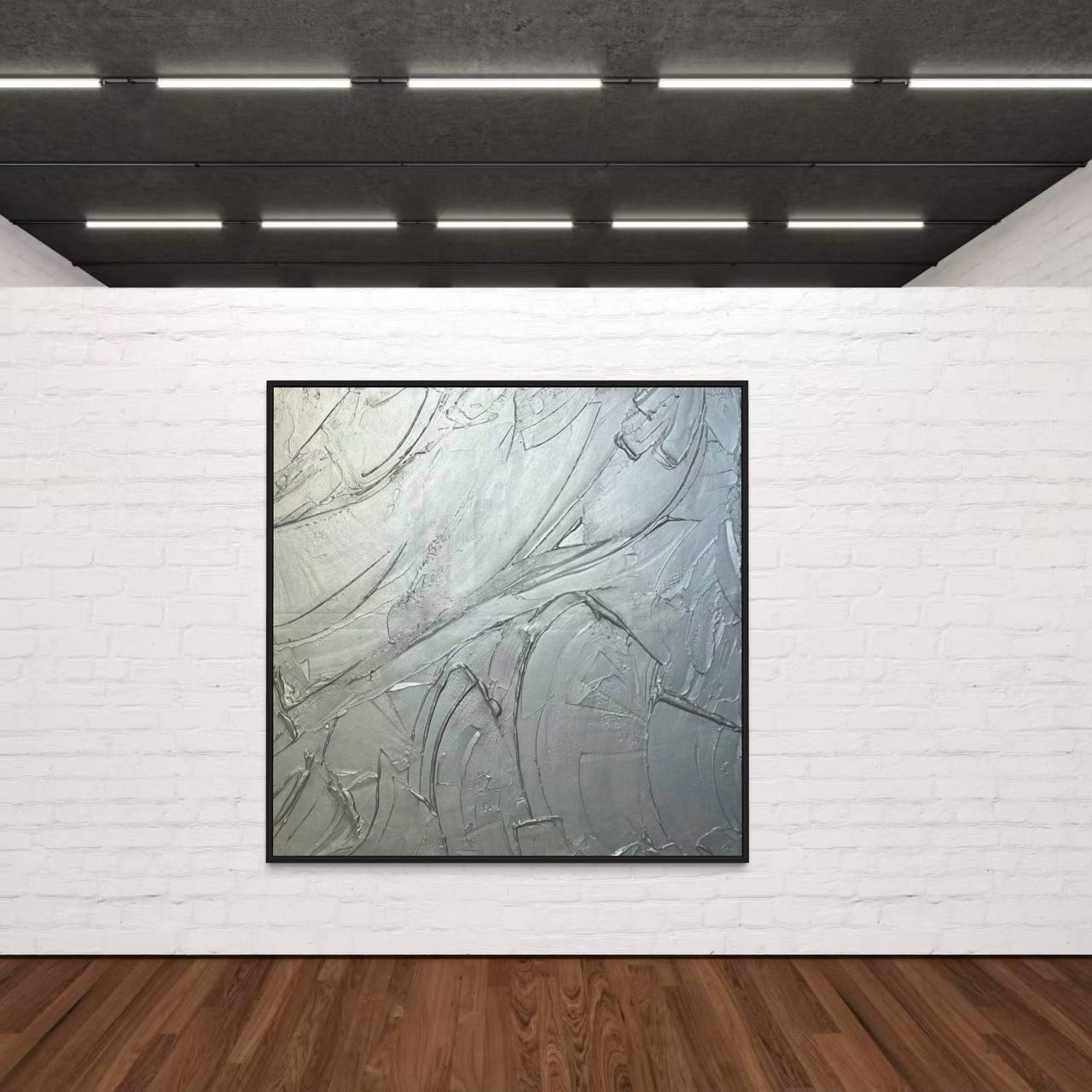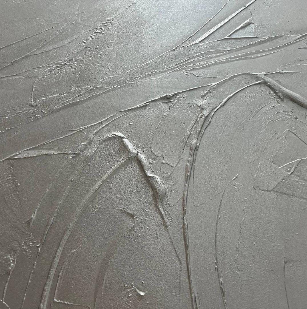 Oversized Silver 3D Plaster Painting: Brutal Minimalist Textured Wall Art