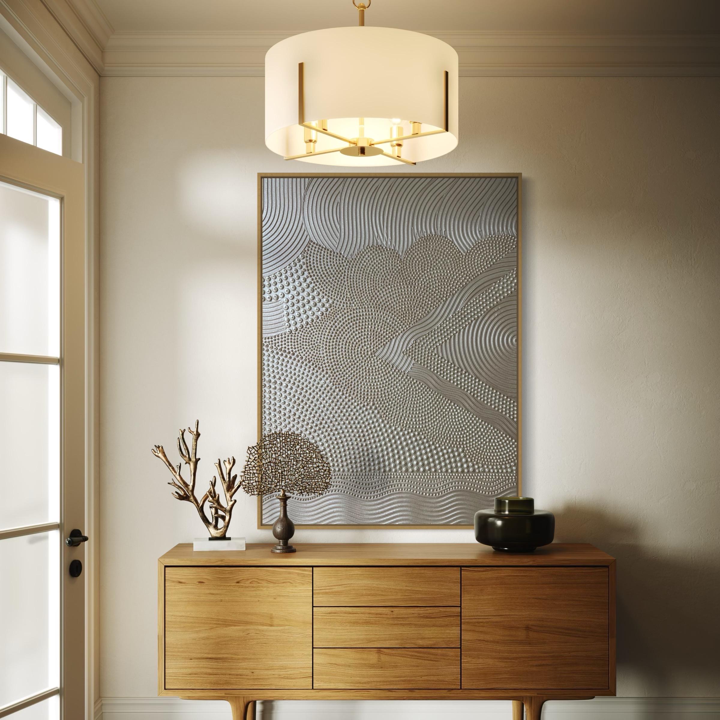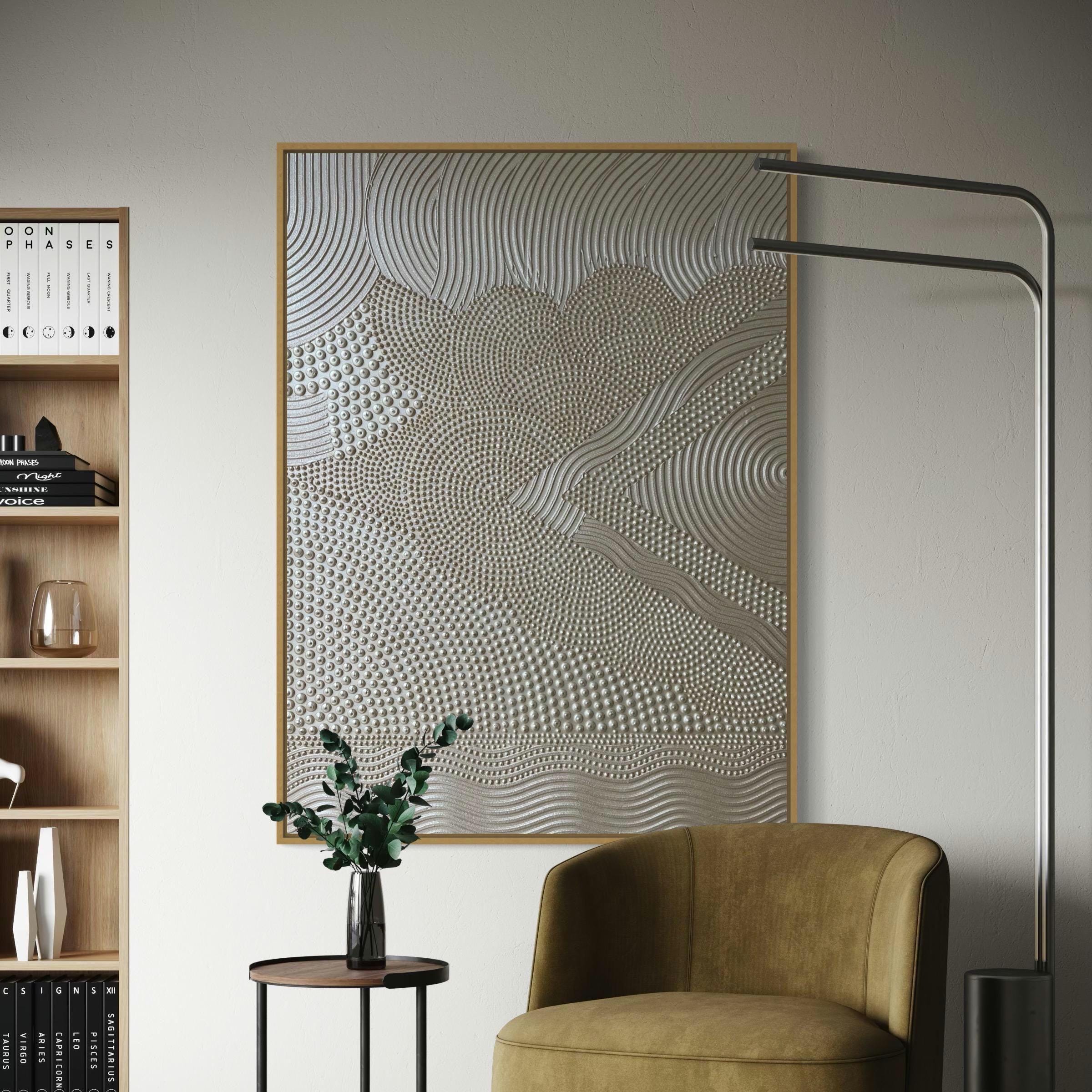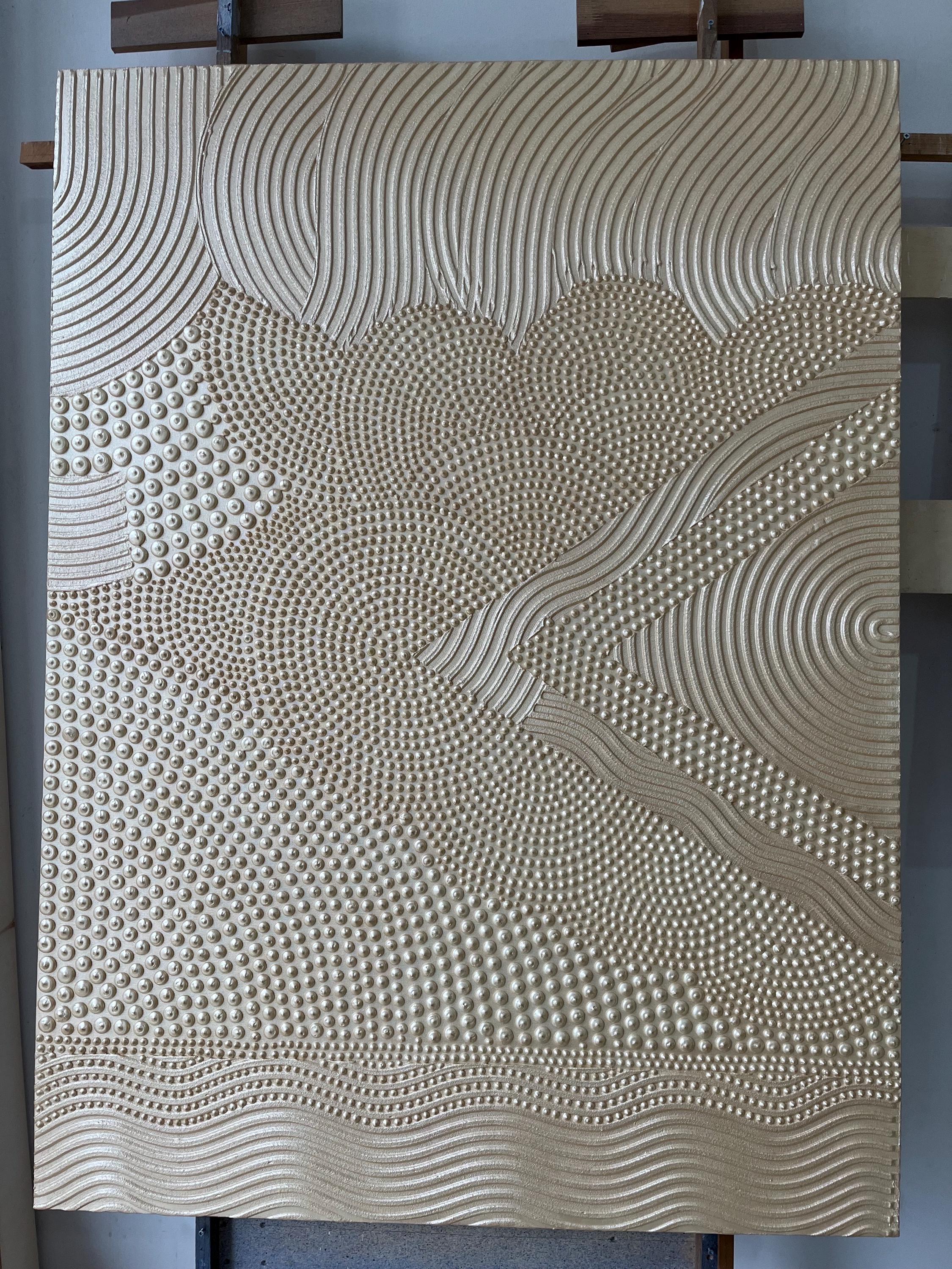 This original handmade artwork is a sculptural plaster painting featuring layered textures, rhythmic curves, and tactile dot patterns. The soft gold, golden pearl palette brings warmth, light, and balance, making the piece timeless and easy to integrate into refined interiors.
