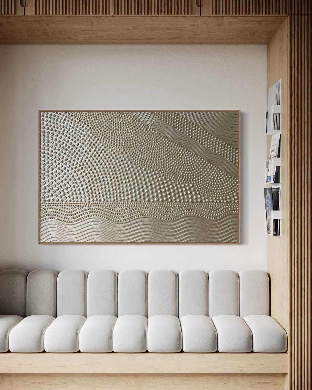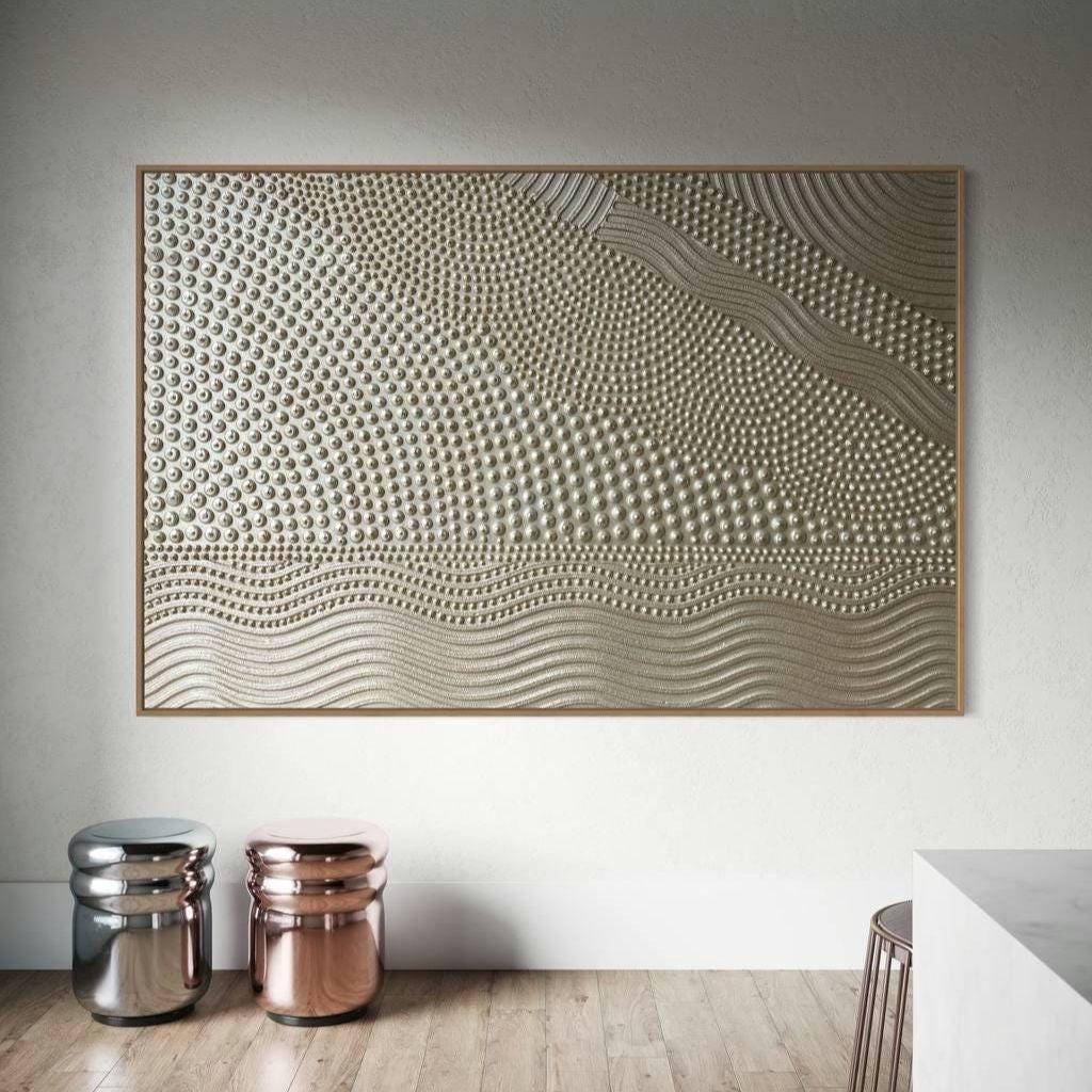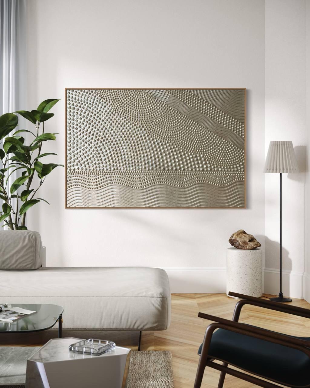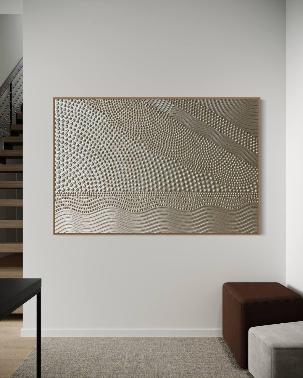This original handmade artwork is a sculptural plaster painting featuring layered textures, rhythmic curves, and tactile dot patterns. The soft gold, golden pearl palette brings warmth, light, and balance, making the piece timeless and easy to integrate into refined interiors.