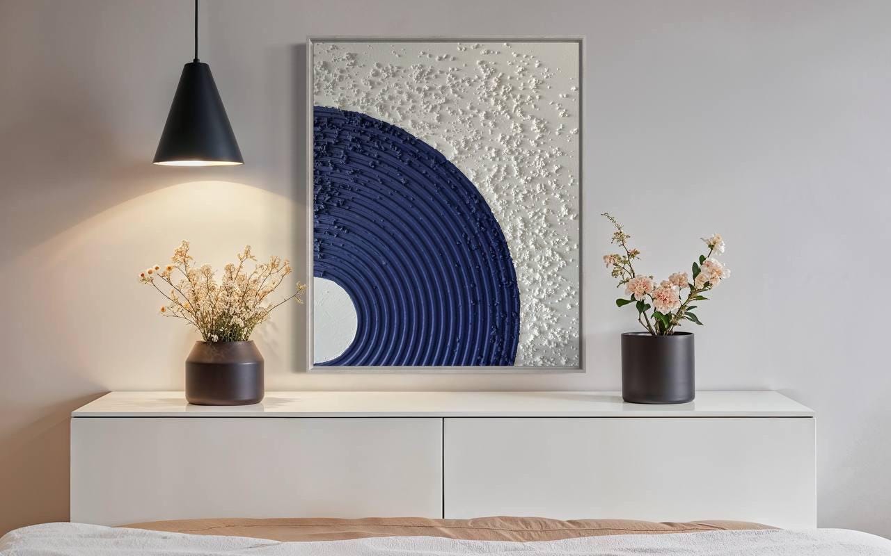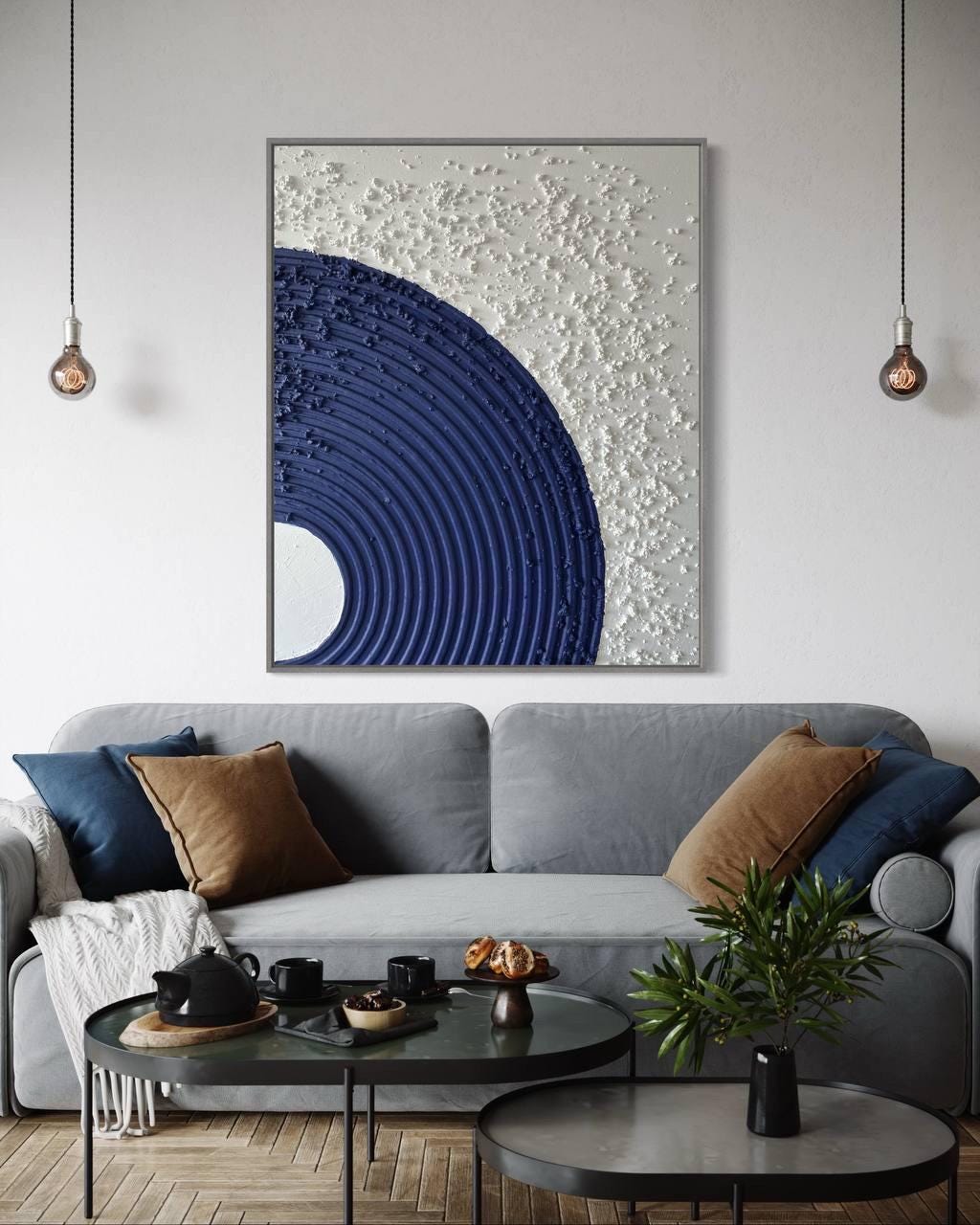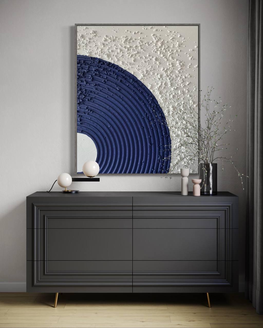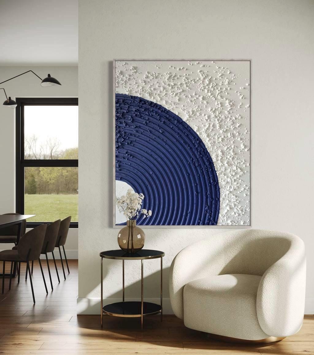This original textured artwork is created using a 3D sculptural plaster technique, forming a deep blue curved shape contrasted with a soft white textured background.