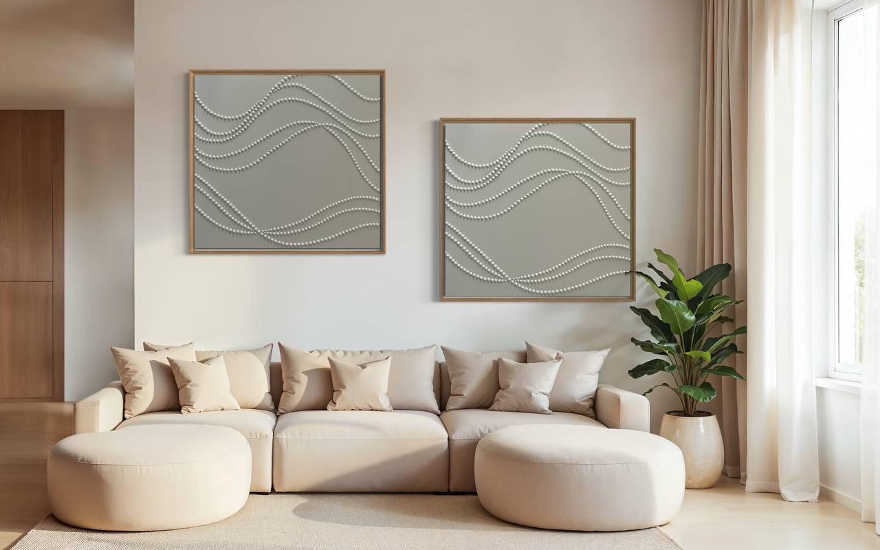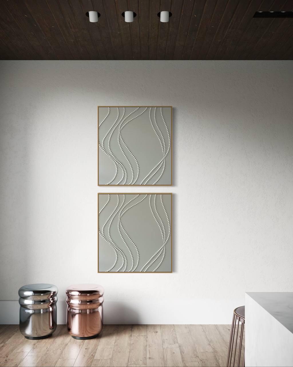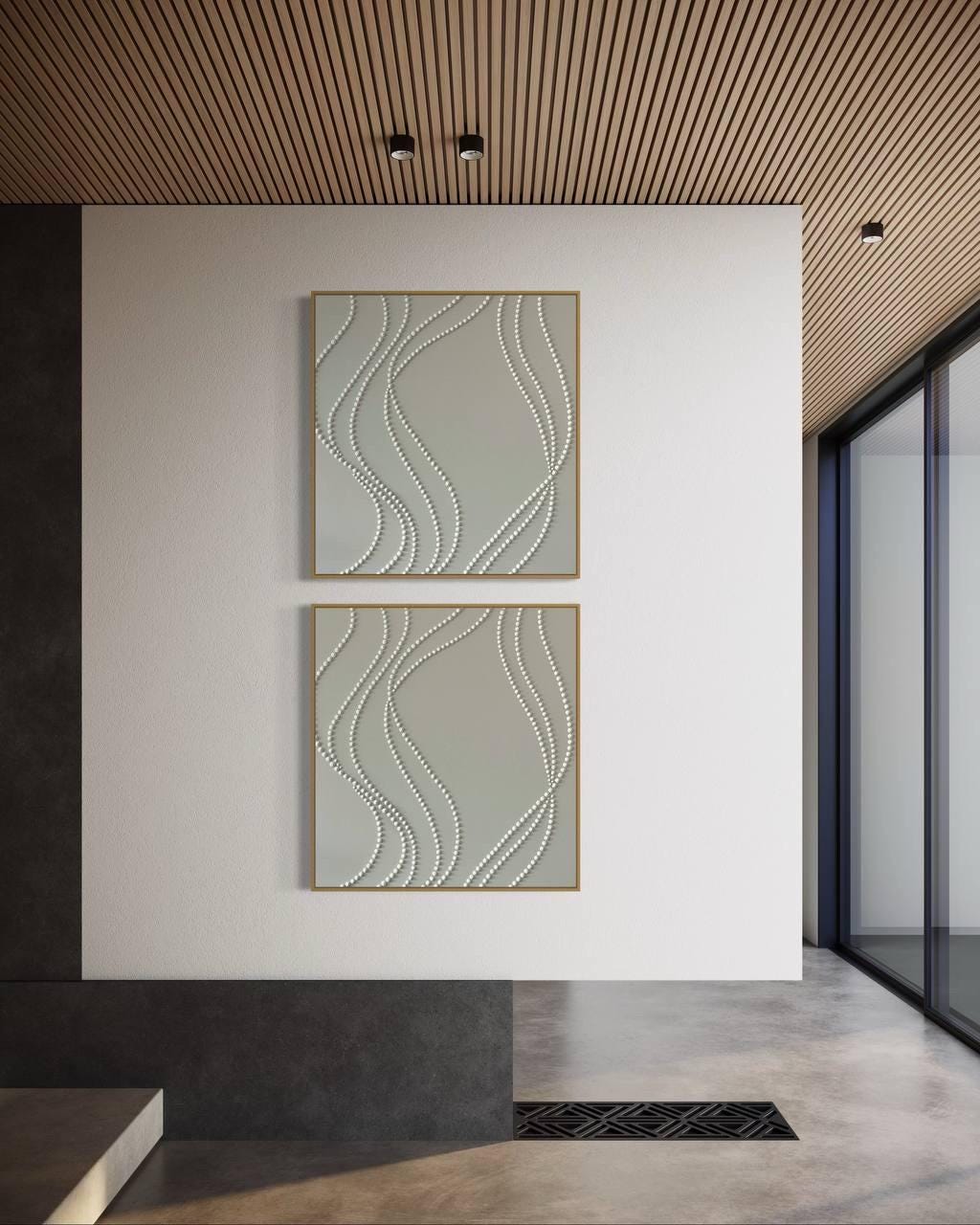 Extra Large set of 2 white wall art 3d plaster minimalist artworks calm textured paintings monochrome wavy lines 3d dots original abstract