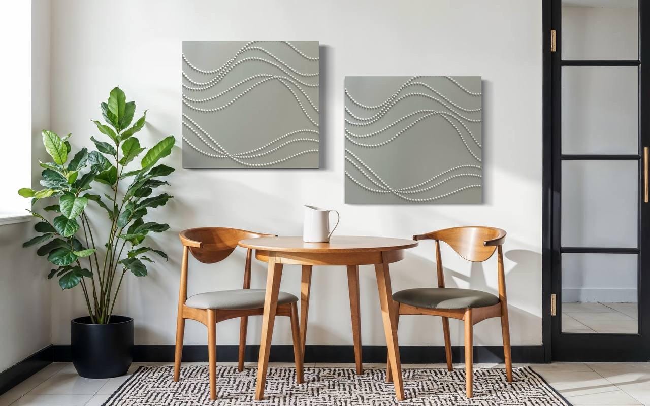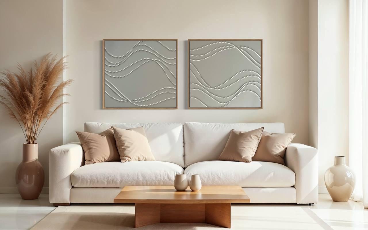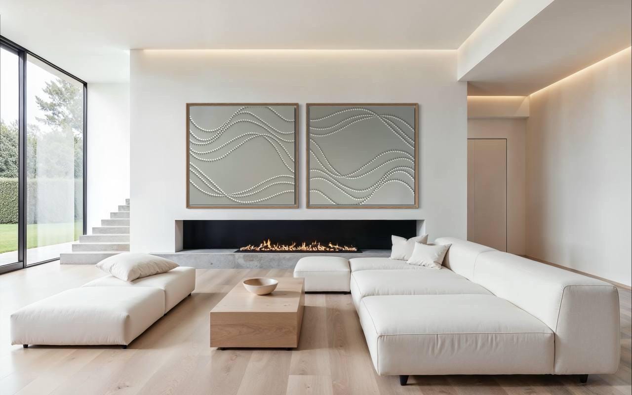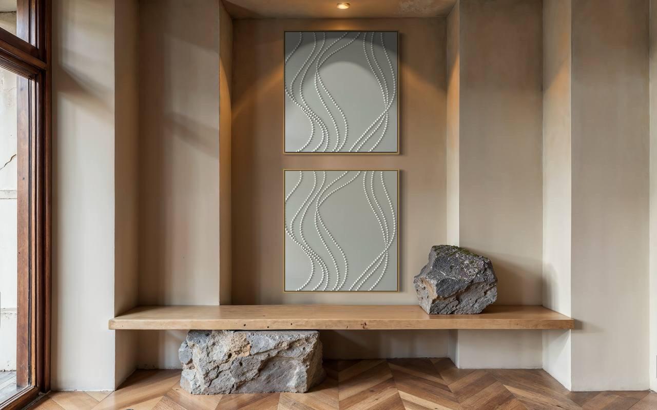 Extra Large set of 2 white wall art 3d plaster minimalist artworks calm textured paintings monochrome wavy lines 3d dots original abstract
