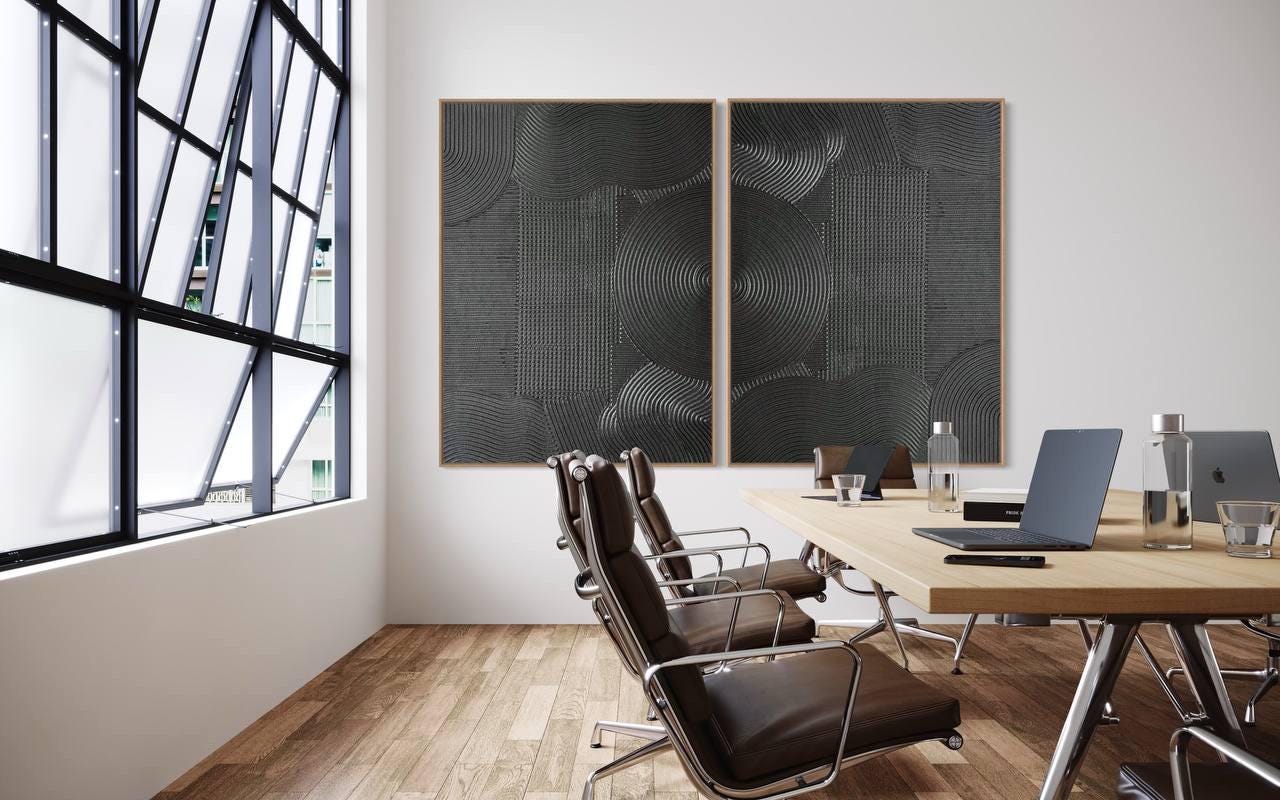 Crafted using high-quality materials—including premium canvas, heavy texture paste, and metallic black acrylic—these 3D wall panels serve as the perfect statement piece for large empty walls. Their black pearl finish adds depth, dimension, and a luxurious glow to interiors, complementing wood tones, neutral palettes, black accents, and modern furniture.