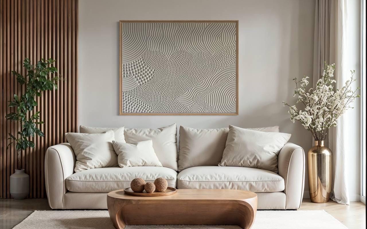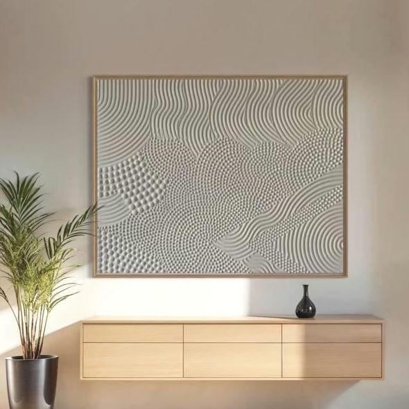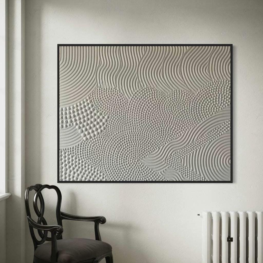 Transform your space with this hand-sculpted, neutral 3D textured wall art, created in calming organic waves and dotted geometric rhythm. Each raised dot and curved relief line is made fully by hand — no prints, no molds — resulting in a tactile, sculptural surface that feels both architectural and soft.