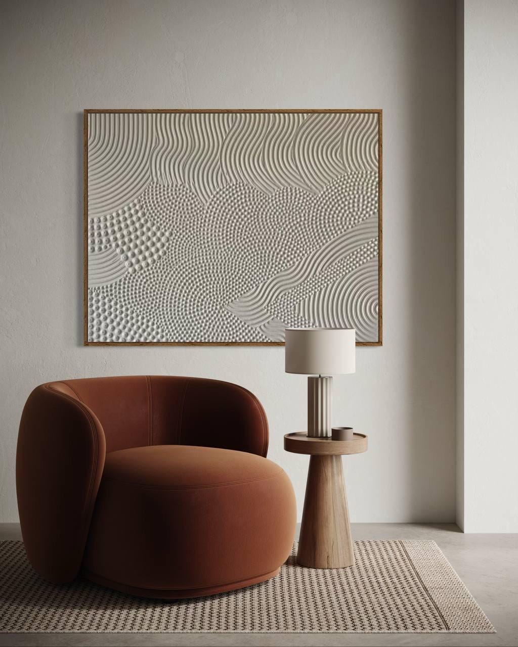 The rhythmic pattern feels meditative, grounding and beautifully tactile — a piece that not only decorates but transforms the atmosphere of your space.