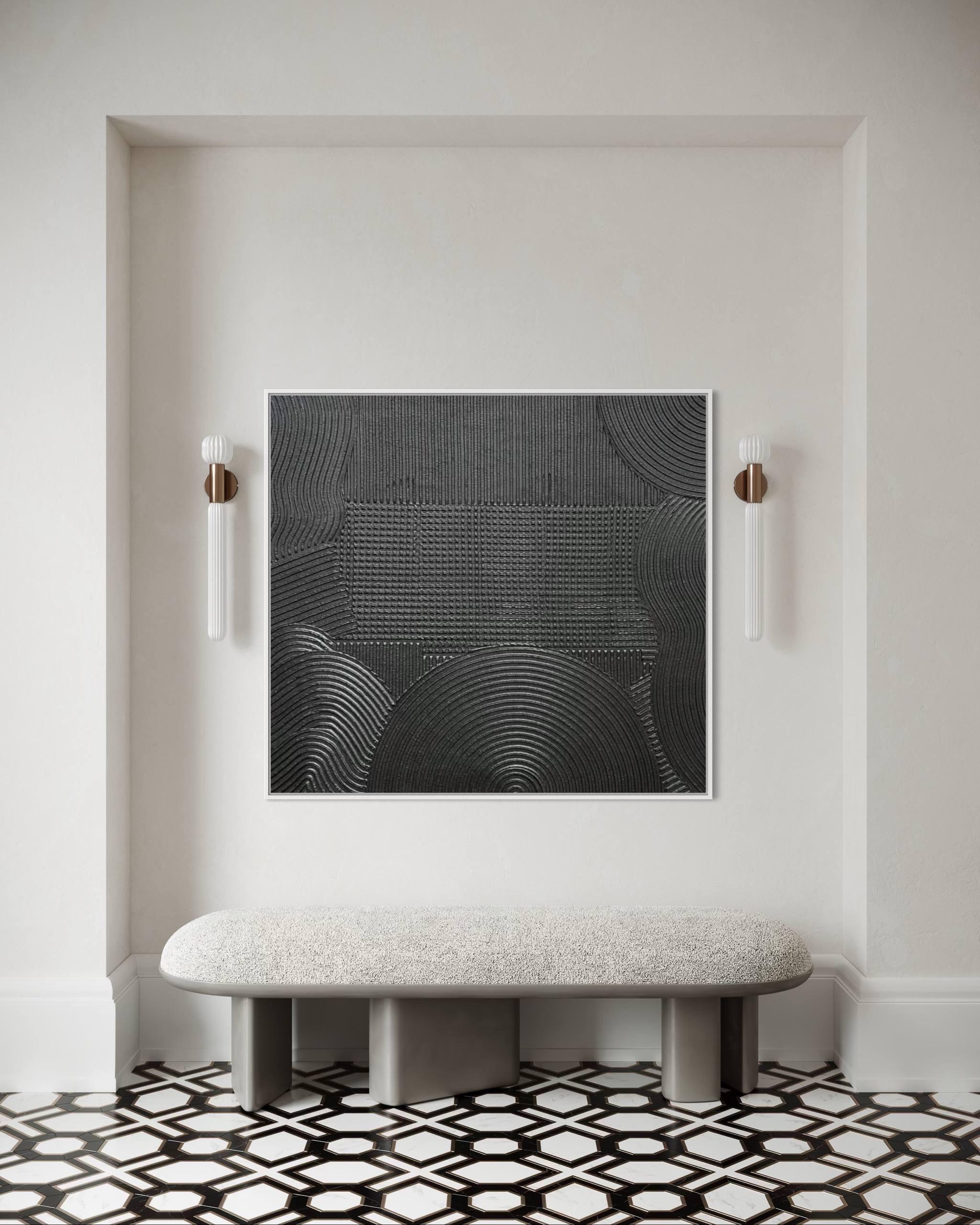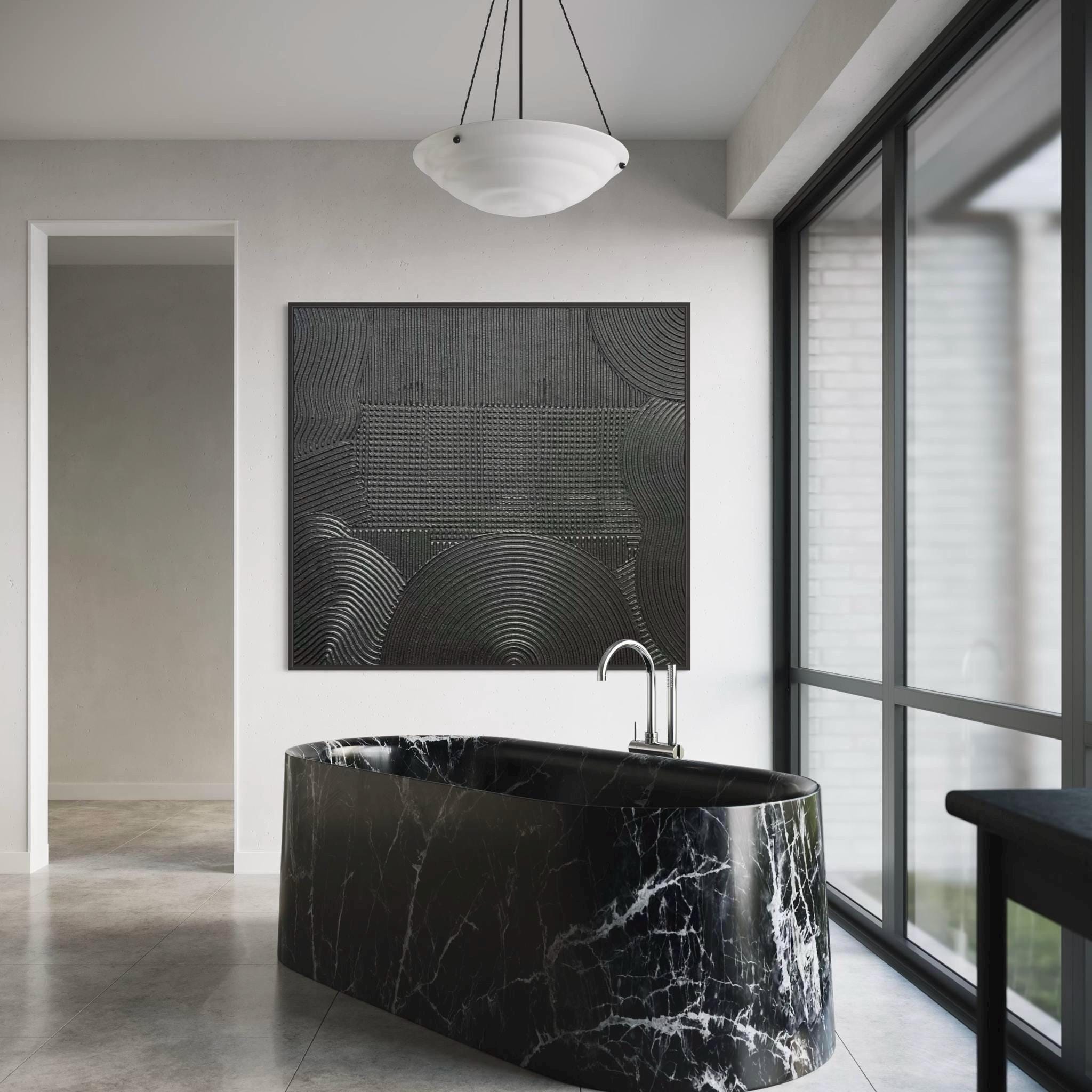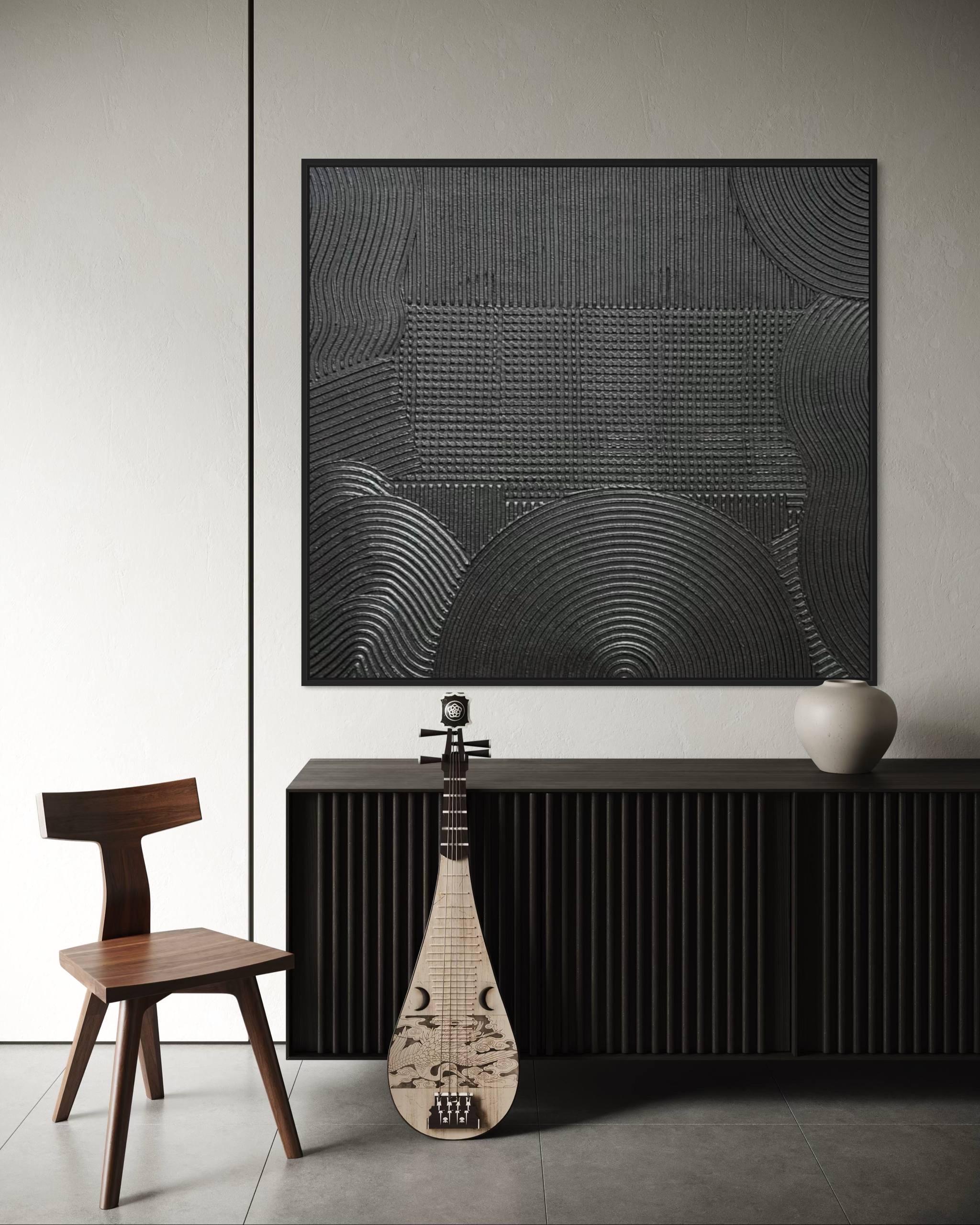 Large modern black textured abstract painting with deep 3D relief and subtle metallic pearl finish.