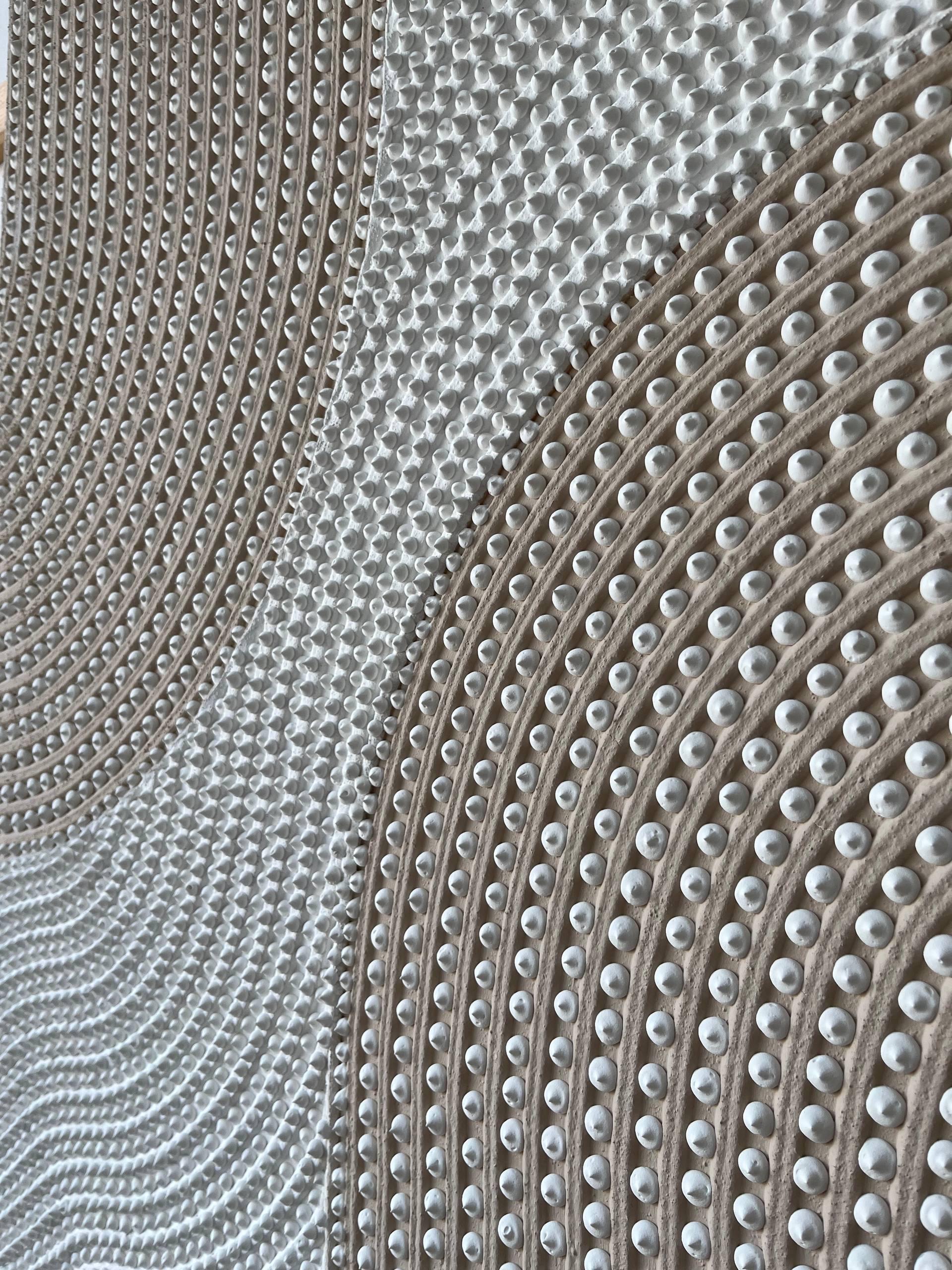Large textured abstract wall art in soft white and beige tones, created with sculptural plaster and raised 3D dots.