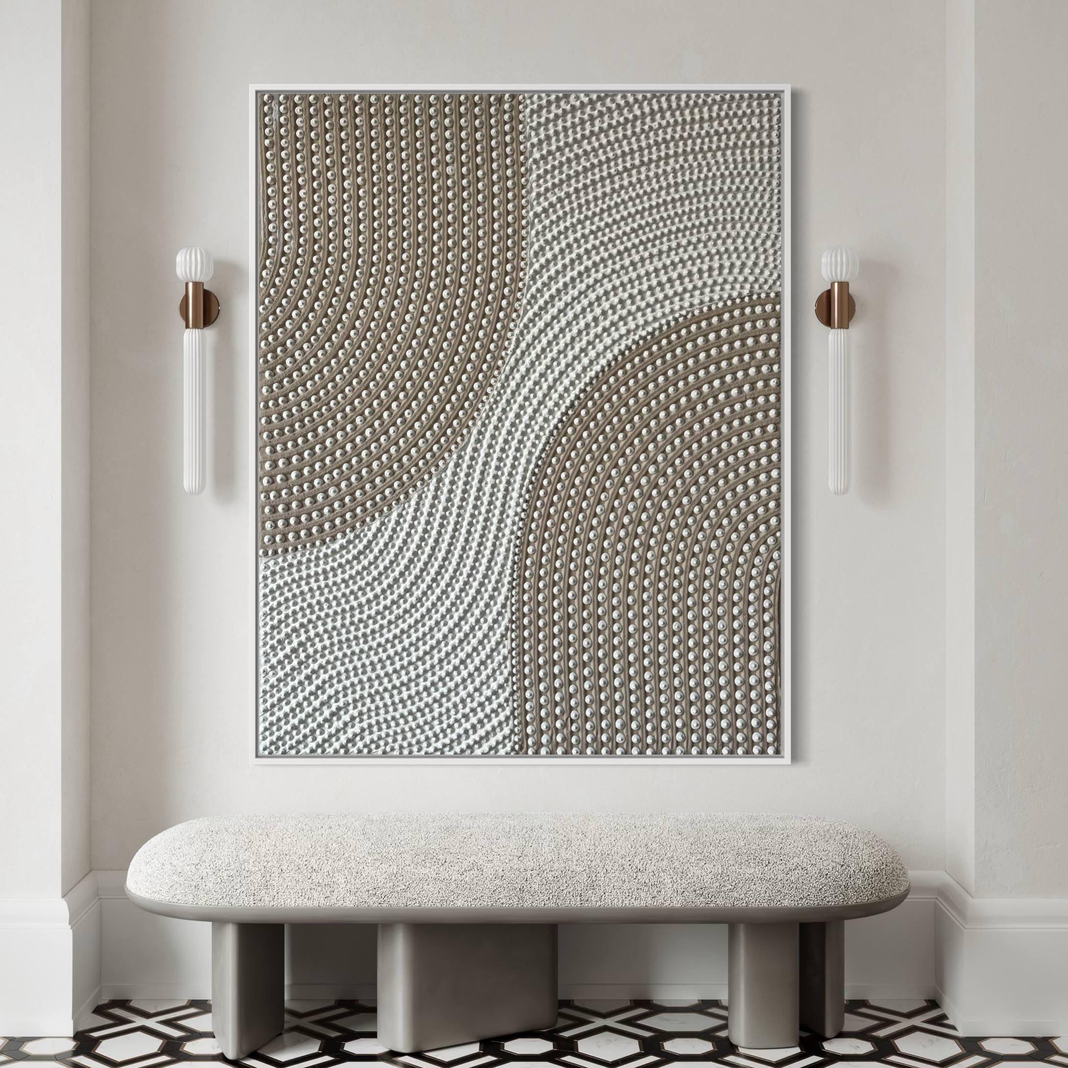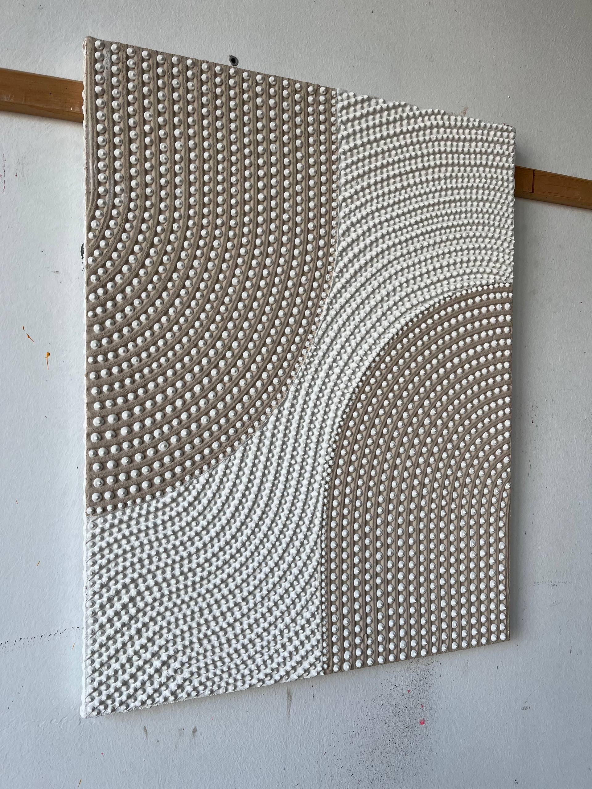 This original handmade artwork is a sculptural plaster painting featuring layered textures, rhythmic curves, and tactile dot patterns. The soft white and beige palette brings warmth, light, and balance, making the piece timeless and easy to integrate into refined interiors.