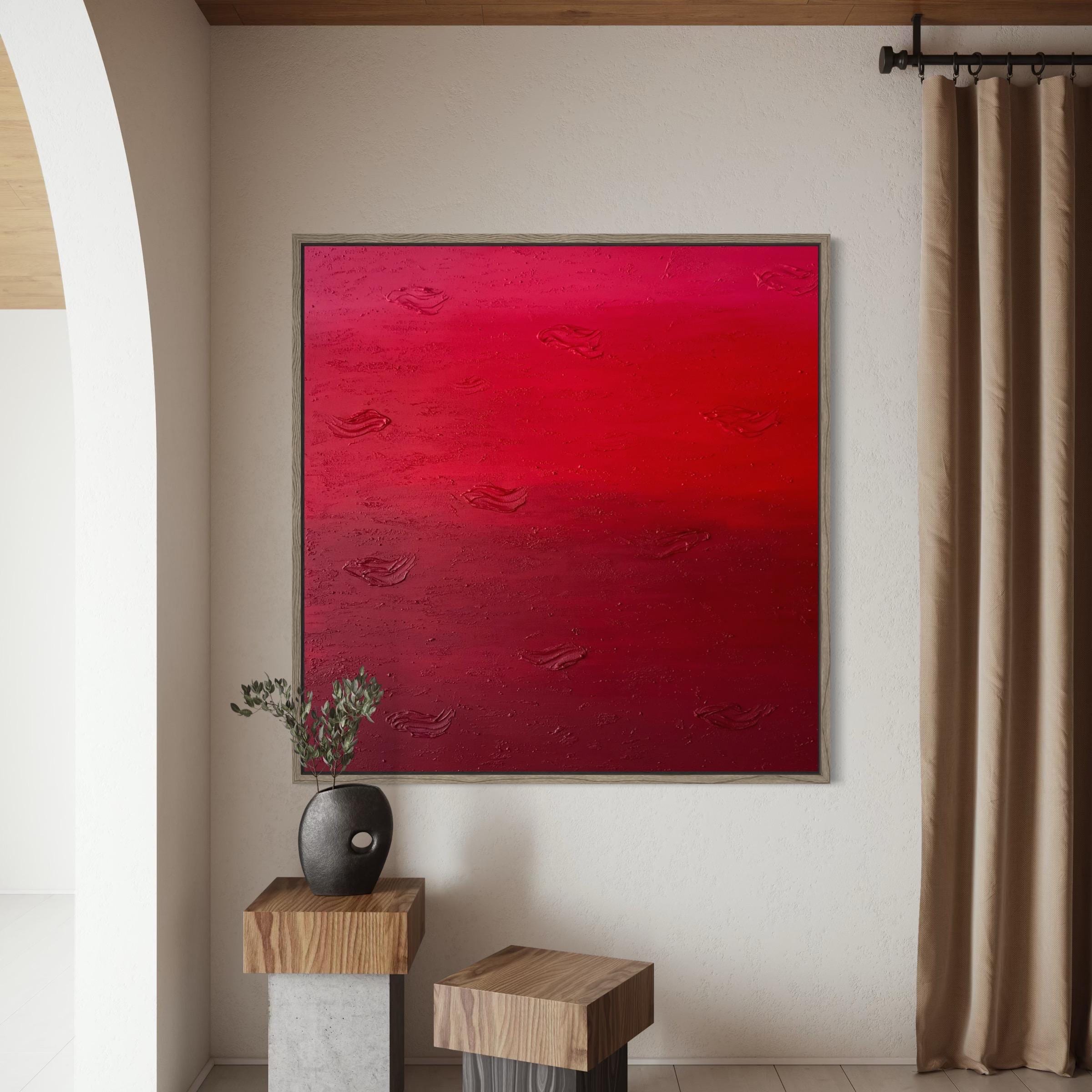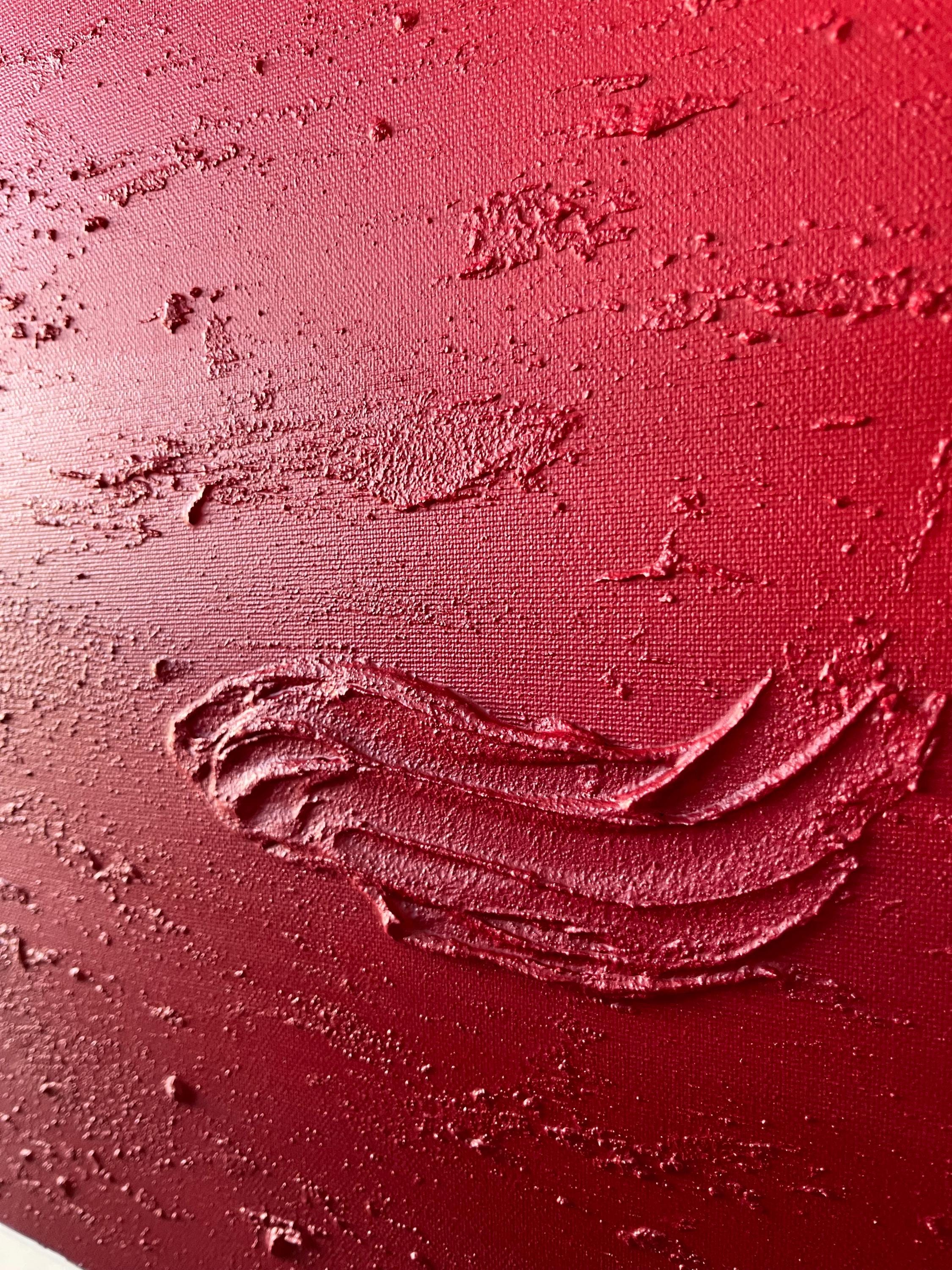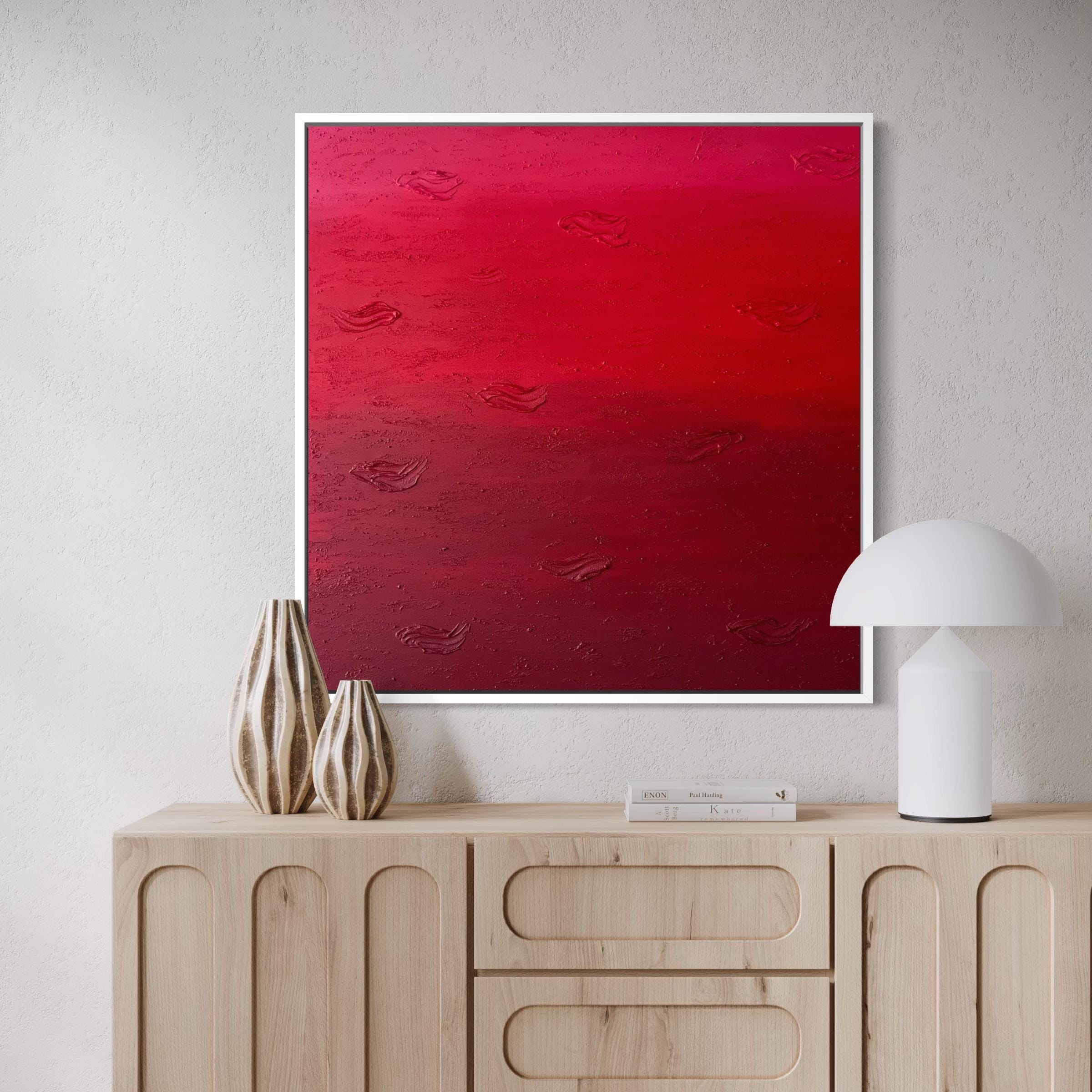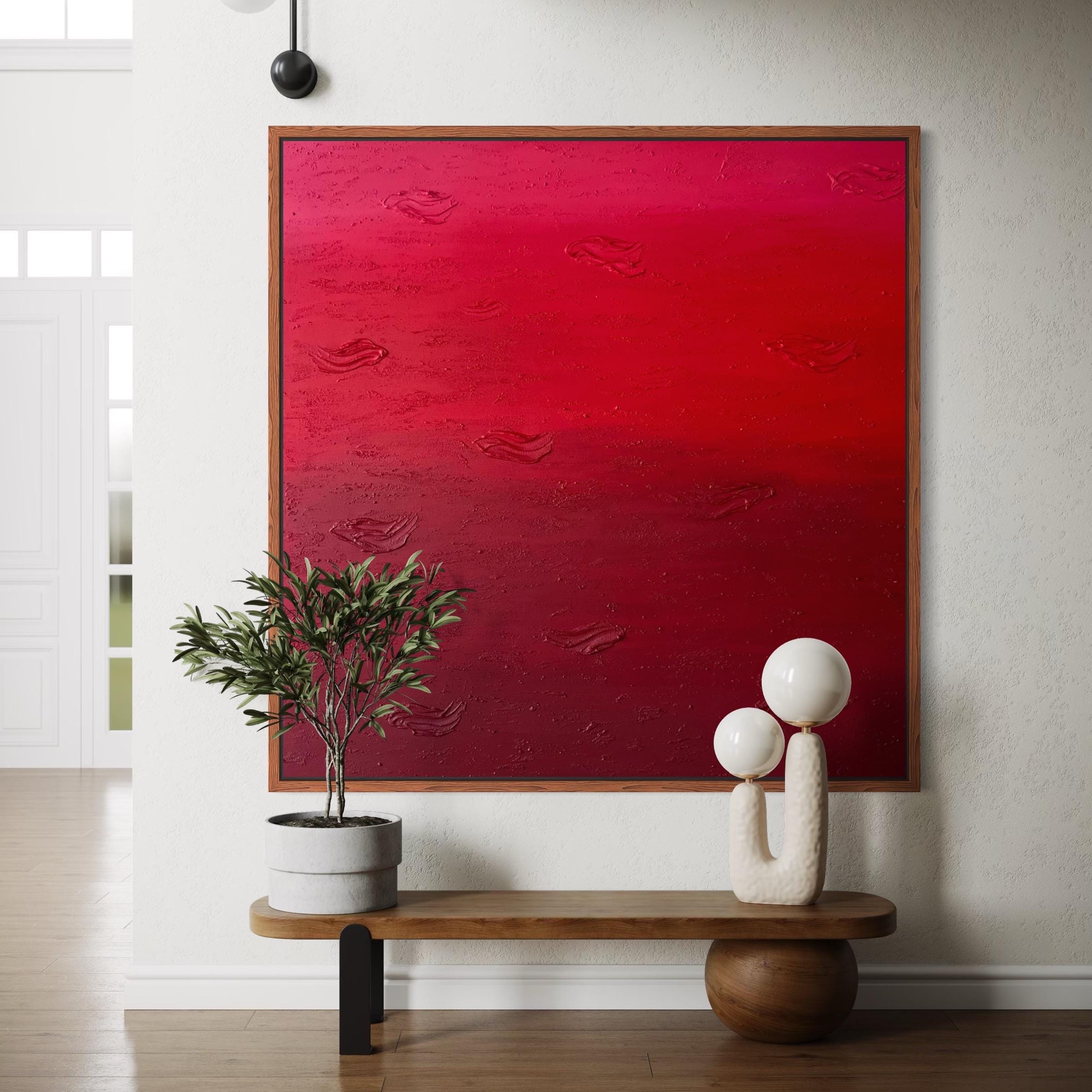 This original hand-painted artwork features rich shades of red with textured abstract details that add depth and movement. Its powerful yet minimalist design brings warmth, drama, and emotion into any space.