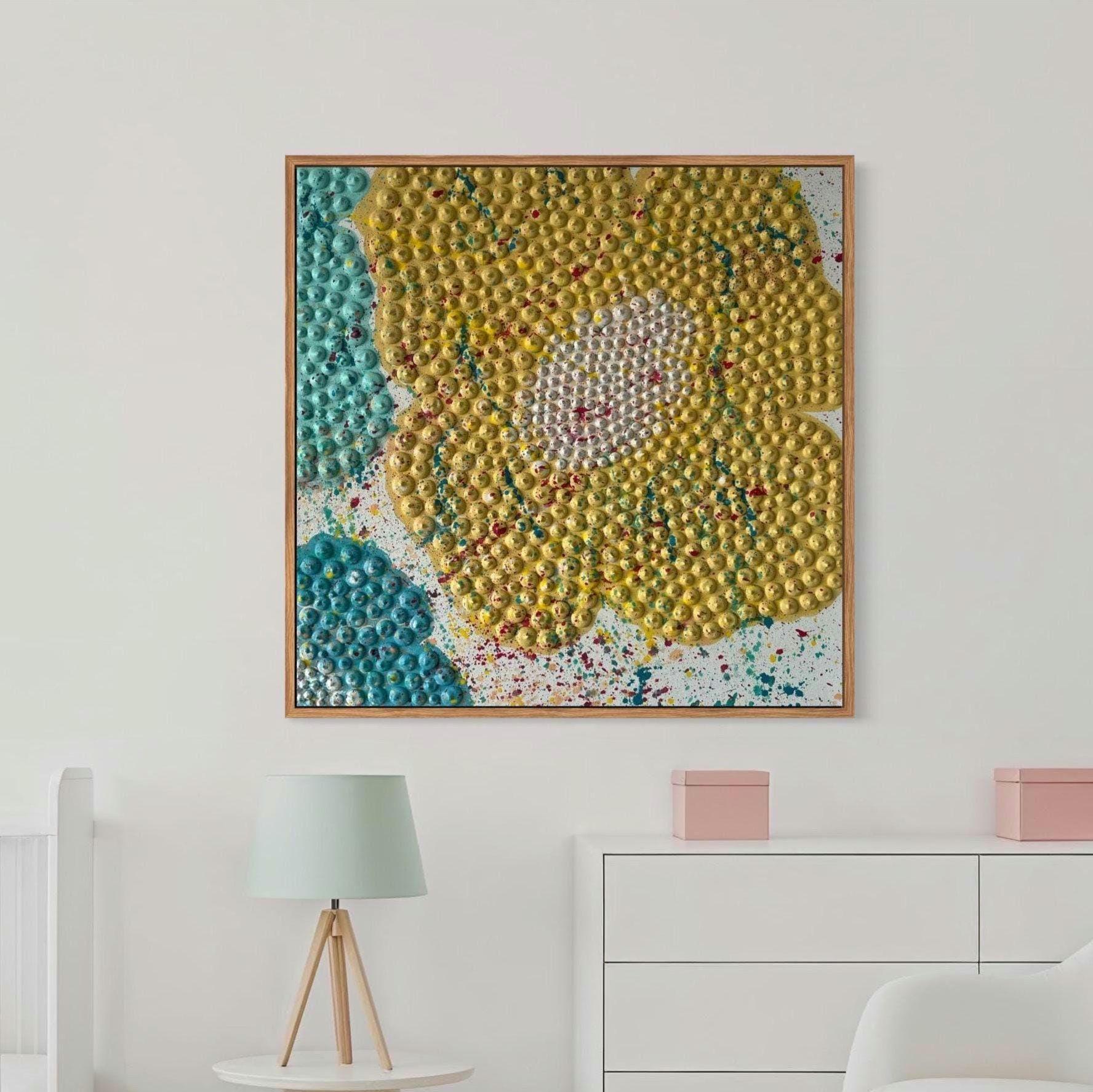 Each dot is meticulously shaped and painted by hand, forming a bold flower composition that balances joy, rhythm and modern abstract form. The sunny yellow petals combined with turquoise detailing and expressive splashes make the artwork suitable not only for kids’ spaces but also for modern living rooms, eclectic interiors, art-focused hallways, cheerful kitchens, creative studios, boutique cafés, hotels and design-led offices.