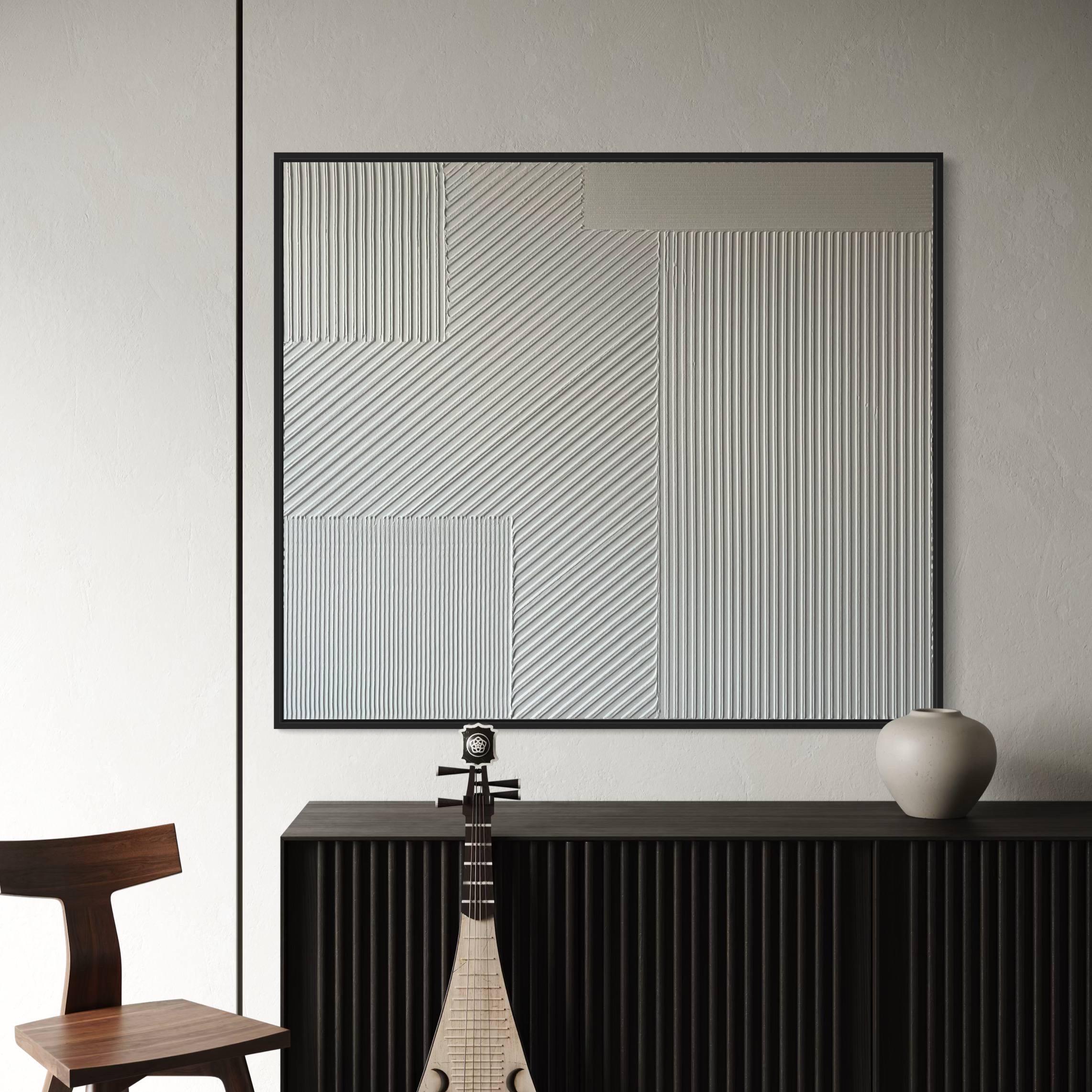 The artwork features raised geometric patterns and linear relief textures, carefully sculpted to create depth, rhythm, and subtle movement.