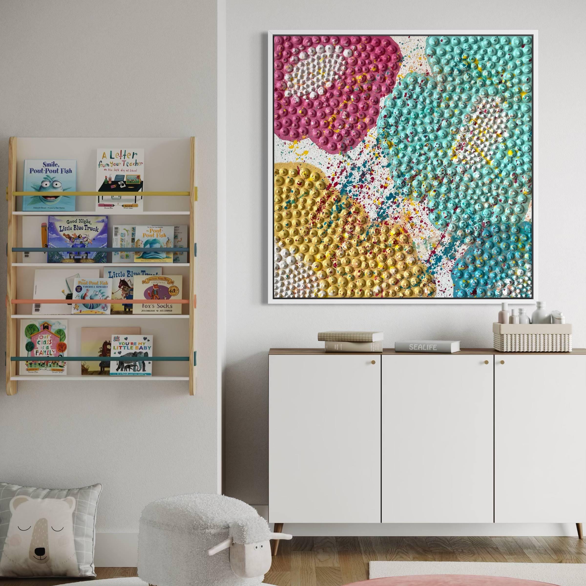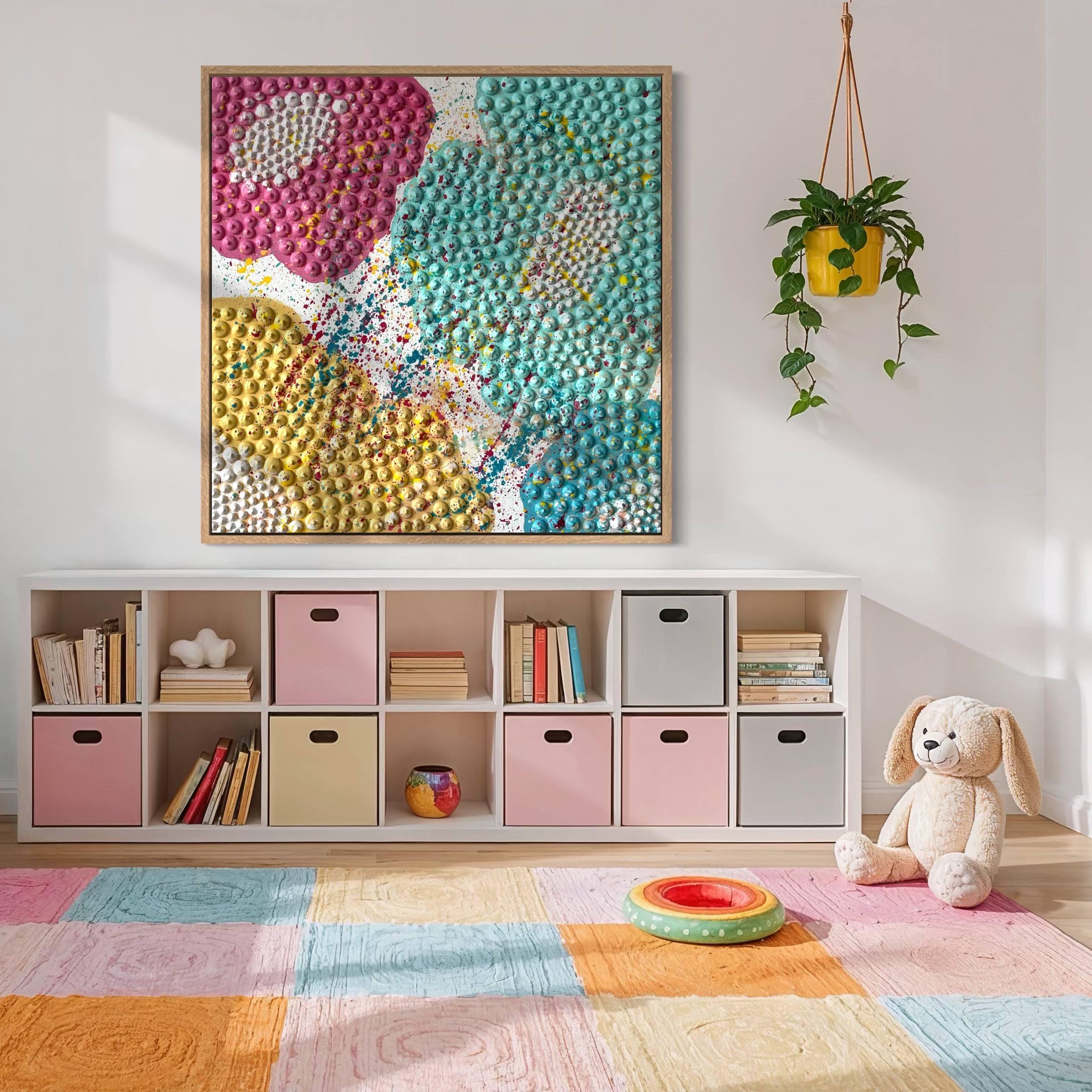 Each dot is meticulously shaped and painted by hand, forming a bold flower composition that balances joy, rhythm and modern abstract form. The sunny yellow petals combined with turquoise detailing and expressive splashes make the artwork suitable not only for kids’ spaces but also for modern living rooms, eclectic interiors, art-focused hallways, cheerful kitchens, creative studios, boutique cafés, hotels and design-led offices.
