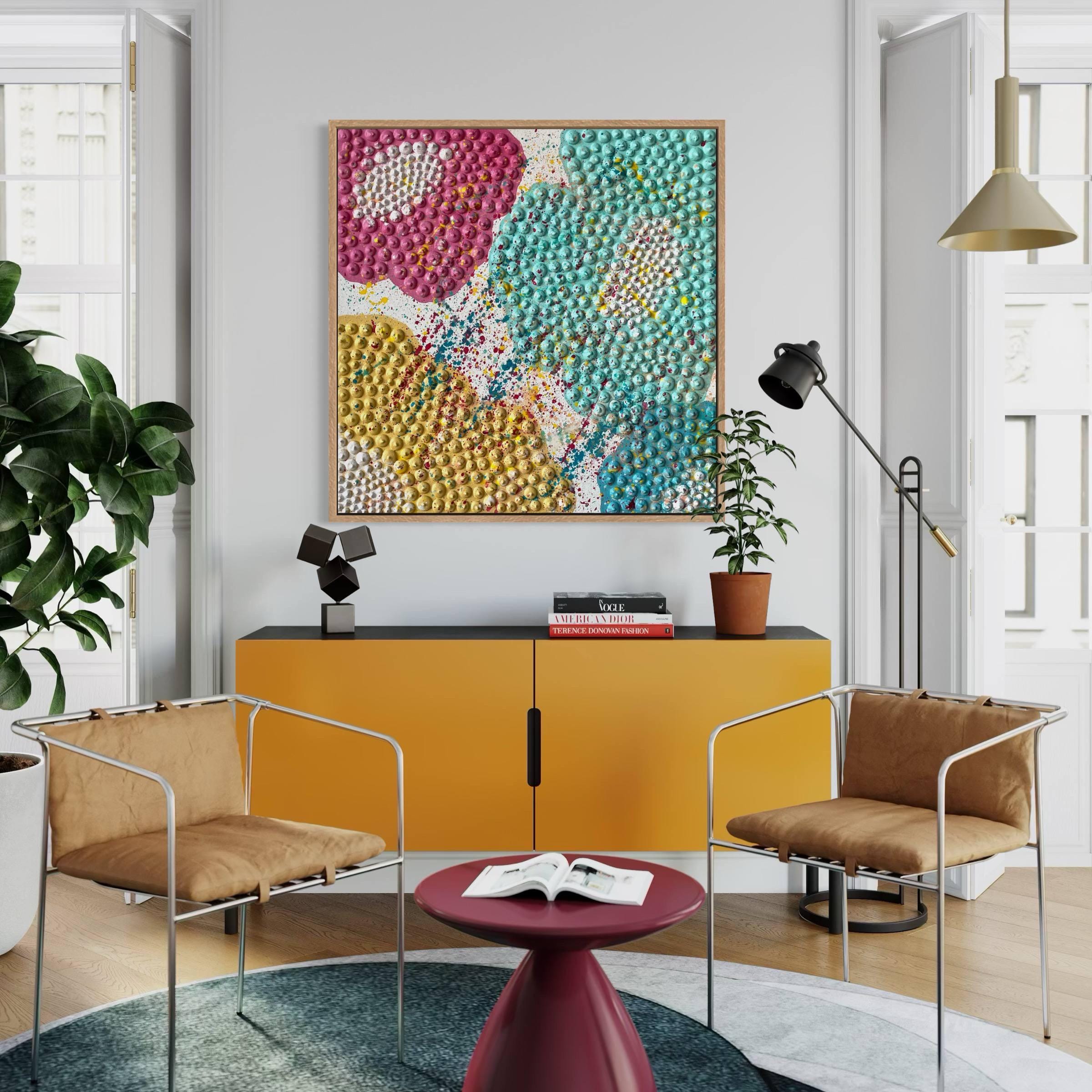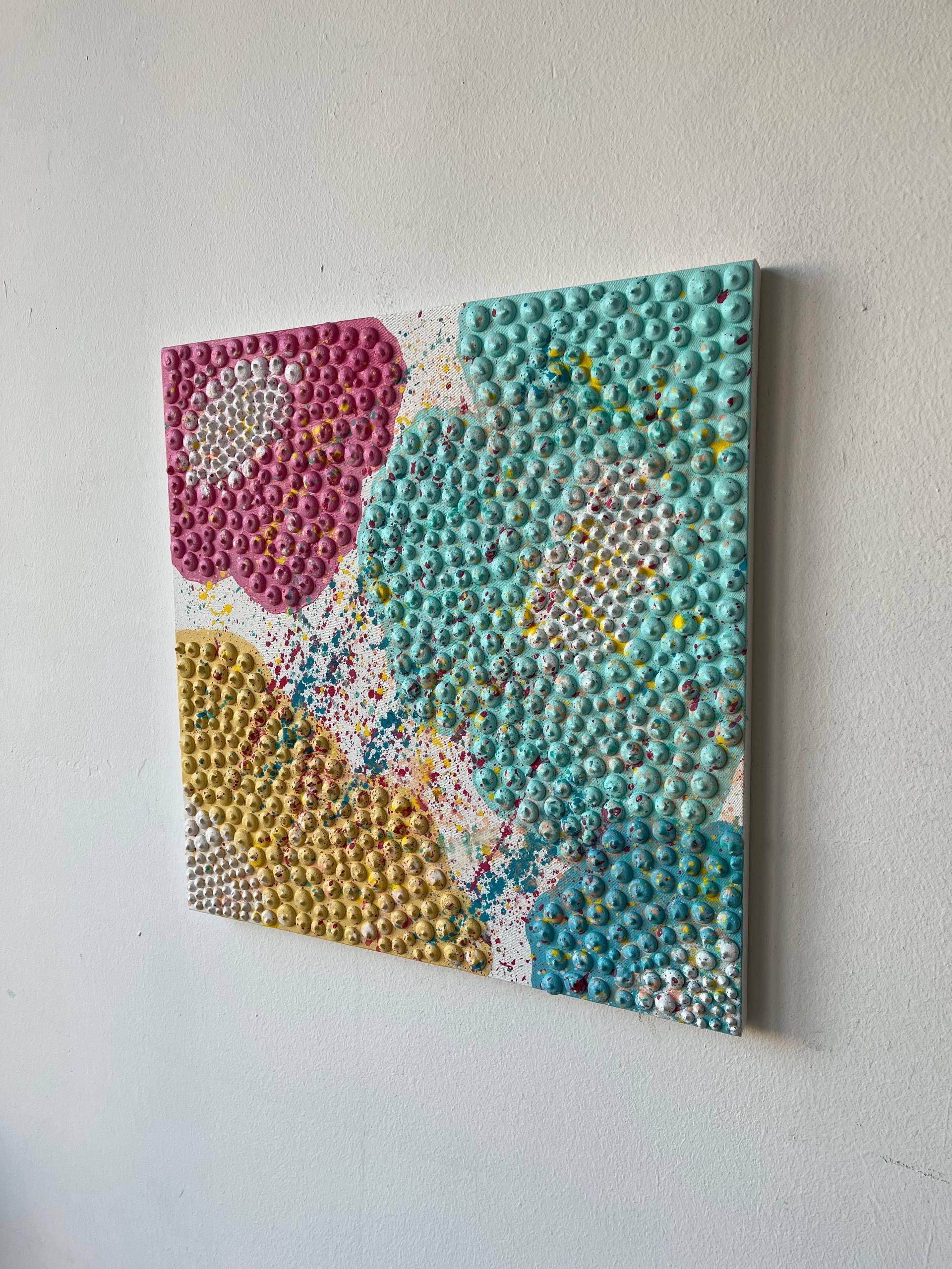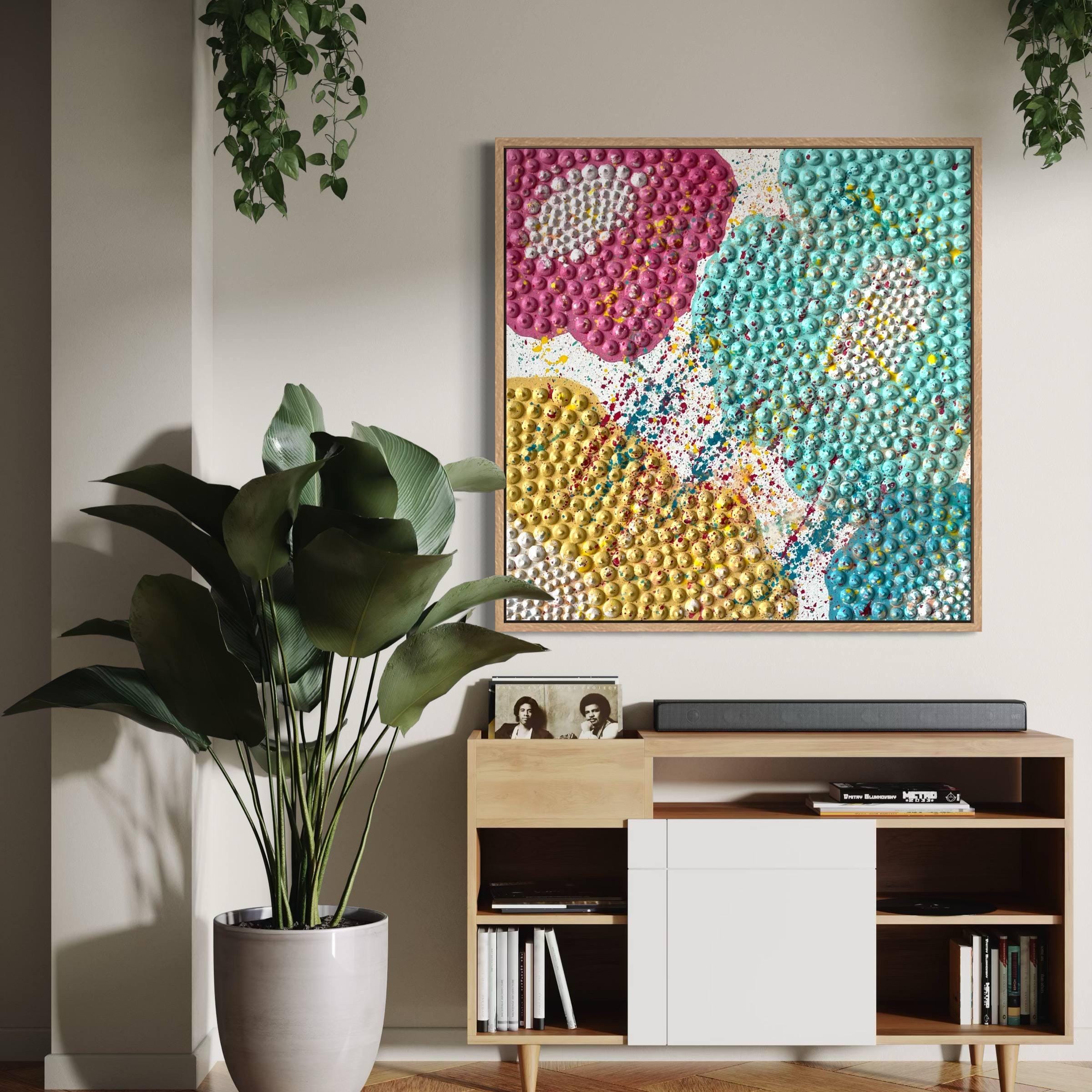 Bring color, joy, and textured elegance to any interior with this handmade 3D floral wall art in bright pink, yellow, blue, turquoise pastel accents. The raised dot-sculptural texture creates a stunning tactile effect that captures light, movement and playful artistic energy. This piece instantly becomes a lively focal point and transforms any space into a vibrant, welcoming environment.
