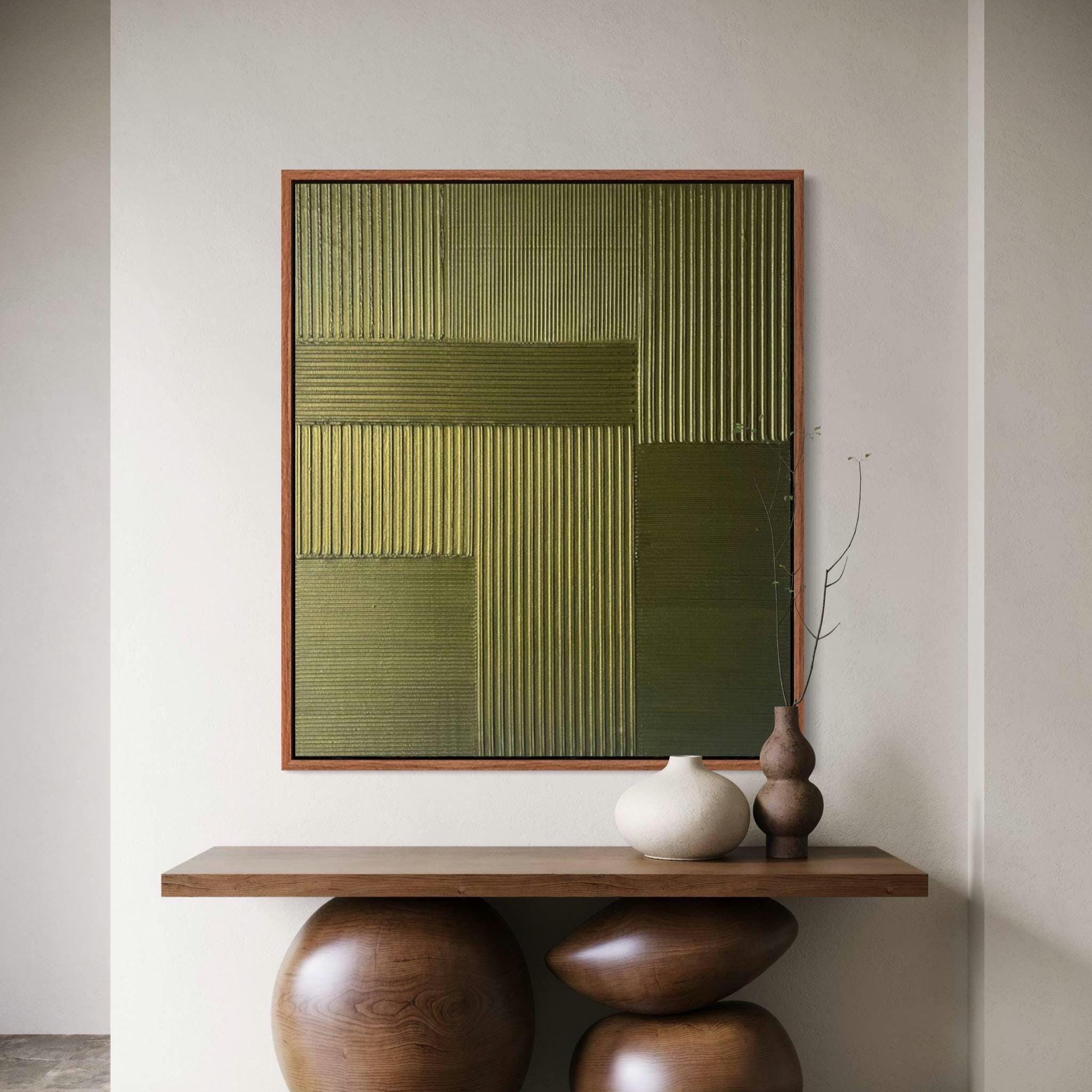 This original green textured abstract painting is inspired by architectural forms, rhythm, and balance. Built with layered texture paste and acrylic paint, the artwork features structured geometric patterns that create depth, movement, and a tactile 3D surface.