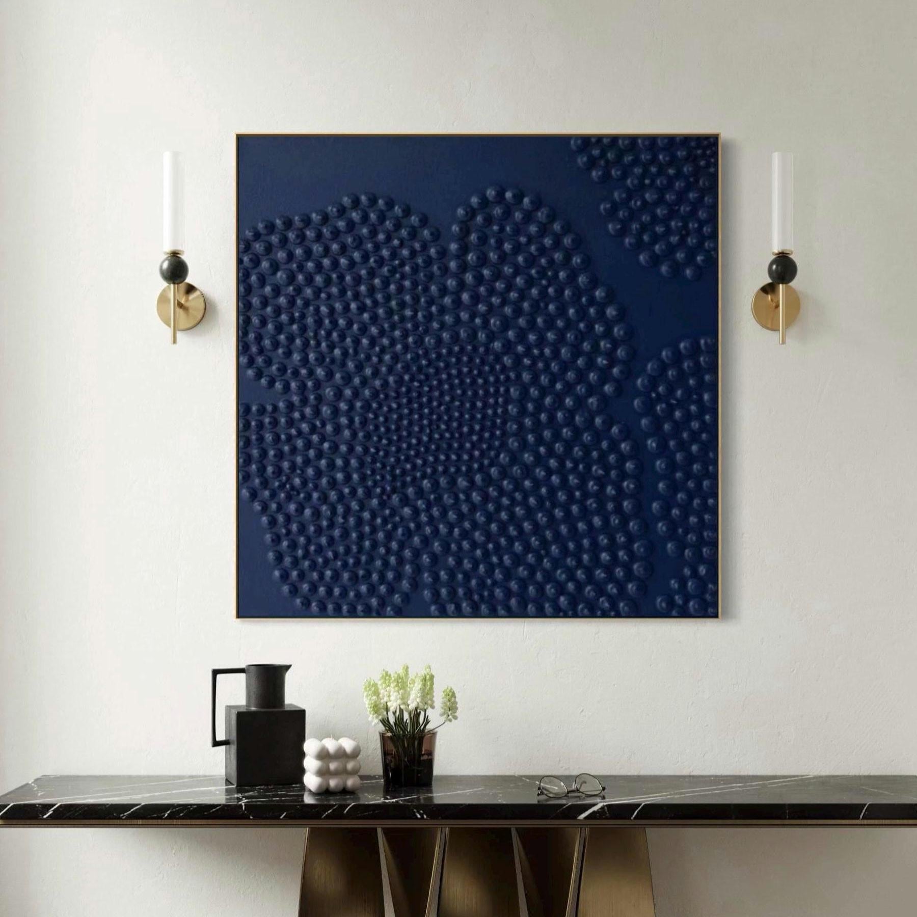 This original navy blue 3D textured floral wall art is created using raised dot technique, forming abstract sculptural flowers with depth and rhythm.