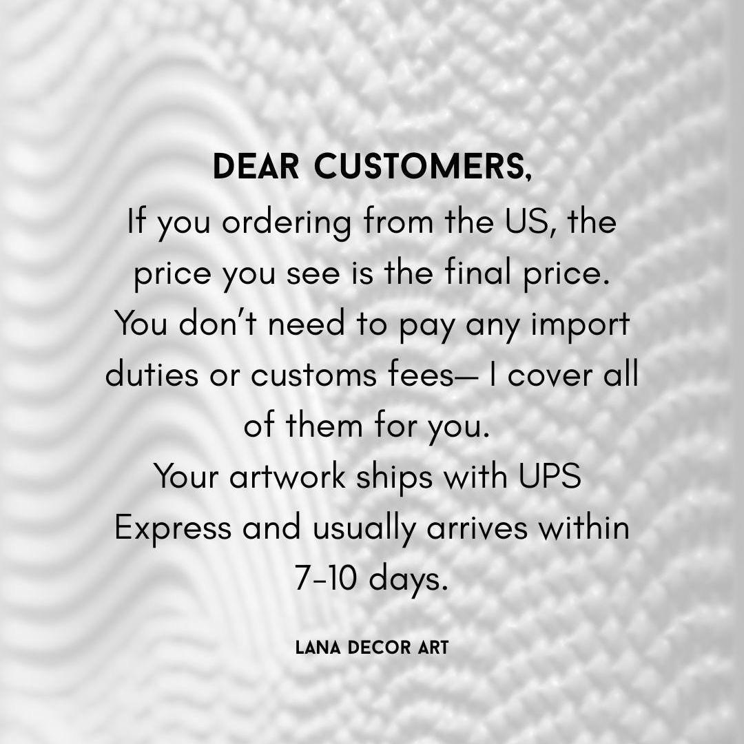 IMPORTANT: If you receive a damaged painting you must save the damaged box and damaged painting so I can immediately file a claim with the shipping company. They will need to see the box & painting to launch their investigation. All of my paintings are fully insured.