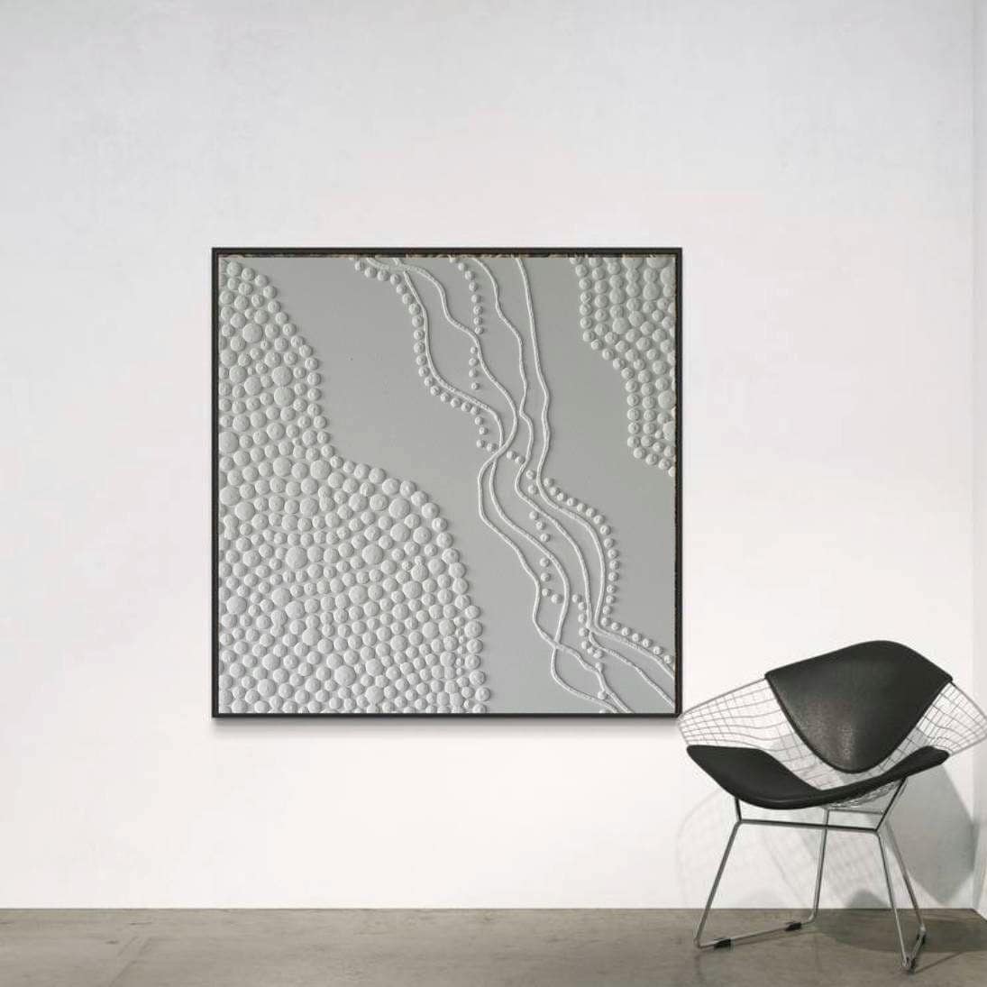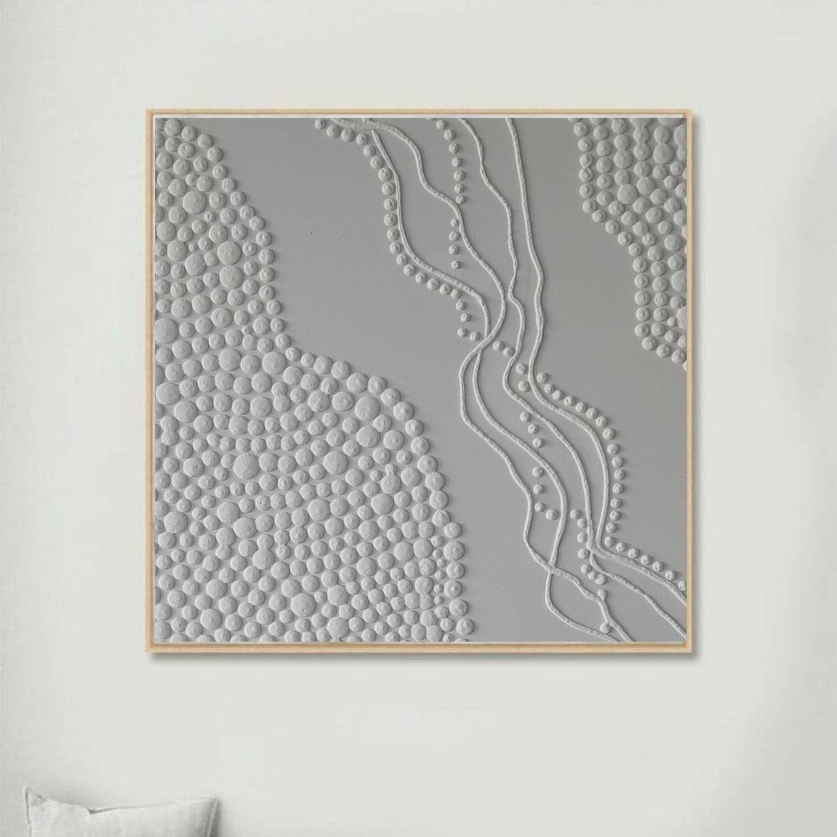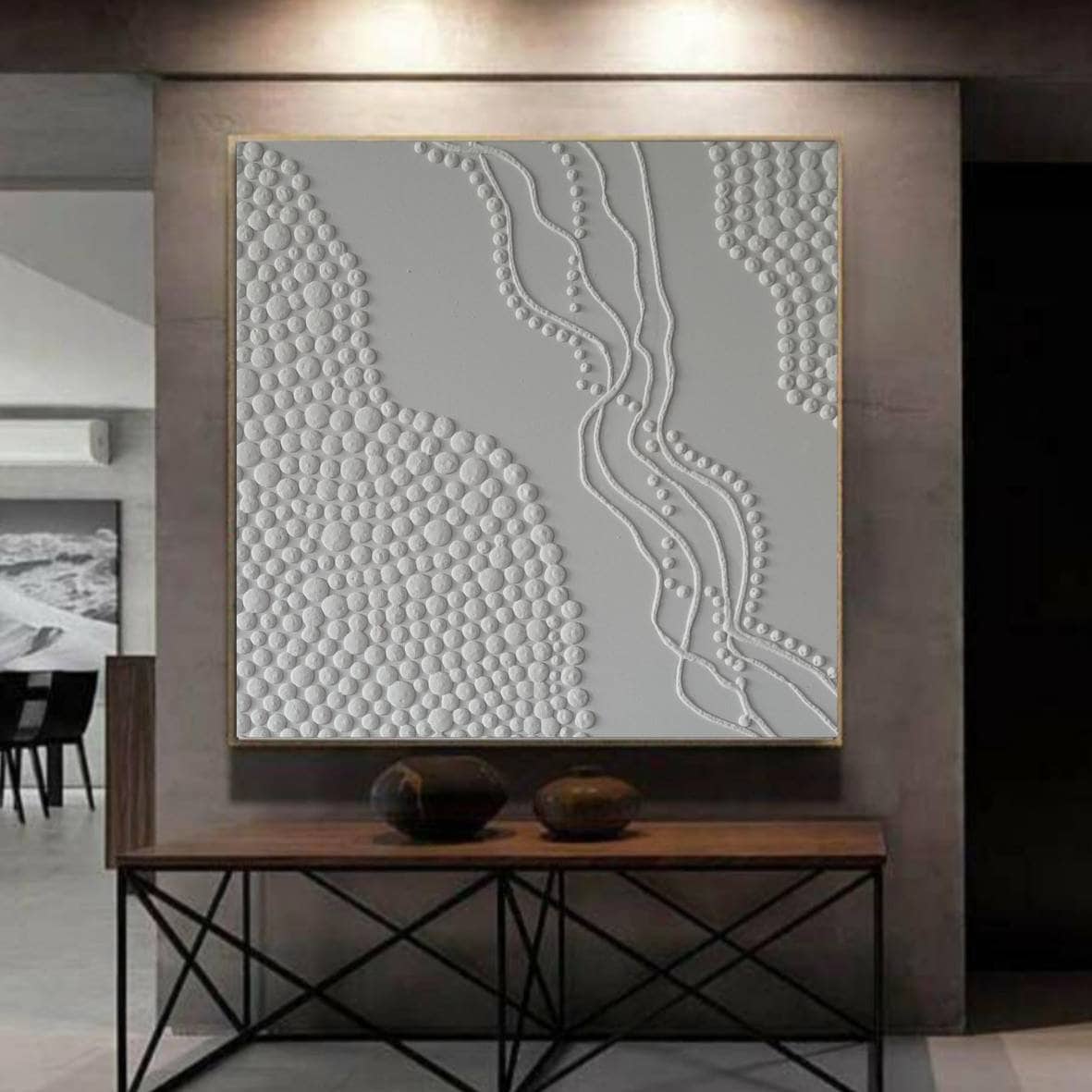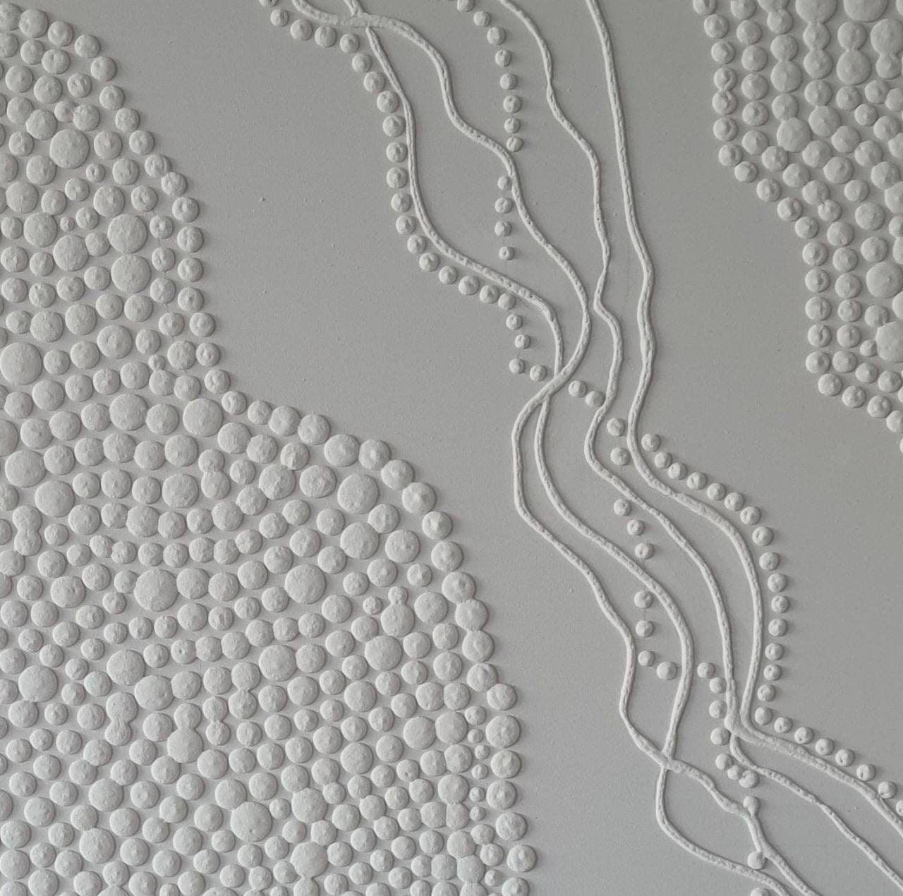 This white 3D textured wall art is a handmade minimalist abstract painting created to bring calm, balance, and modern elegance into your interior. The artwork features sculptural raised dots and soft organic relief, creating a subtle three-dimensional effect that casts beautiful natural shadows depending on the light.