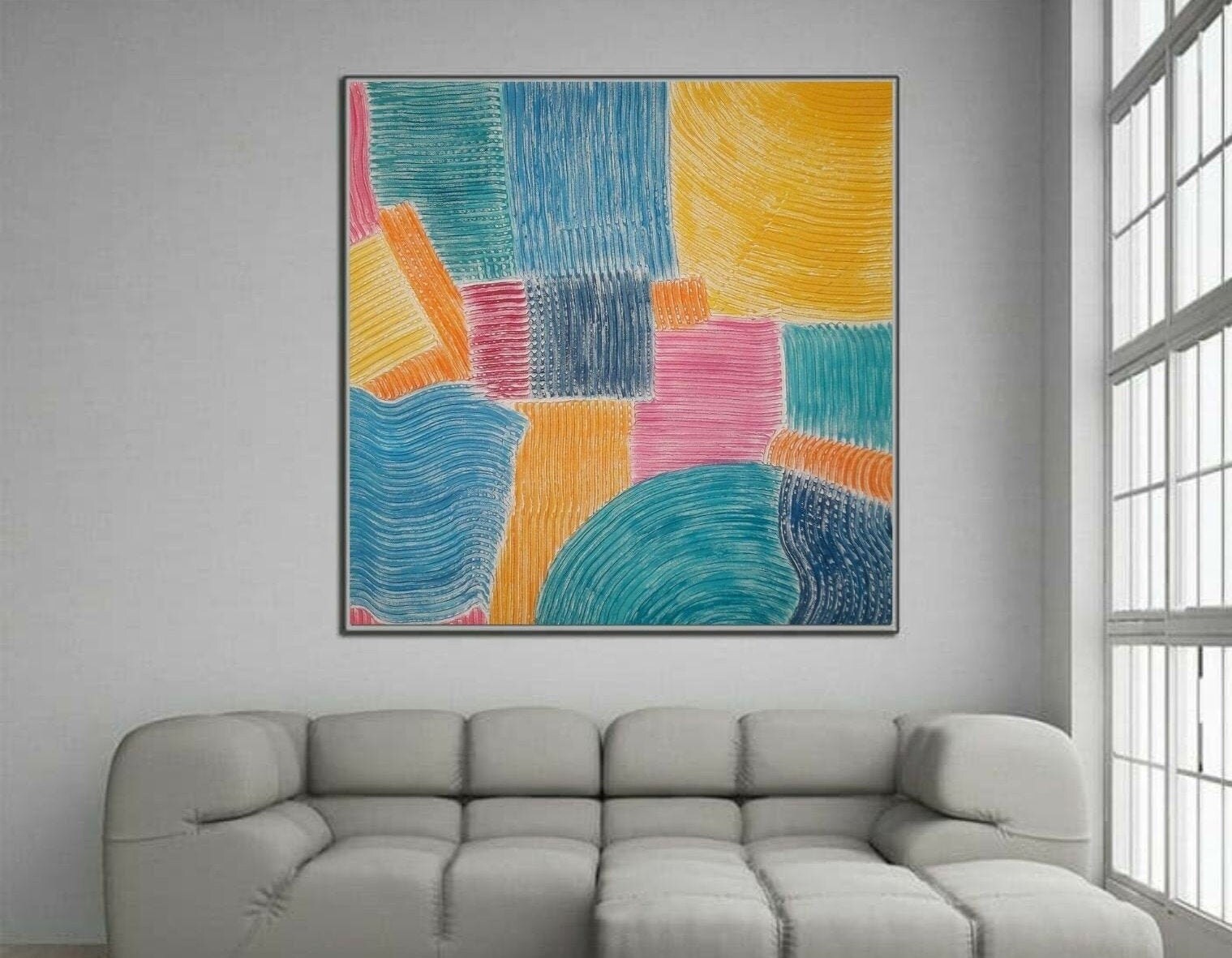 This large bright minimalist textured painting is completely handmade using sculptural plaster techniques, creating a striking 3D relief surface that plays beautifully with light and shadow.