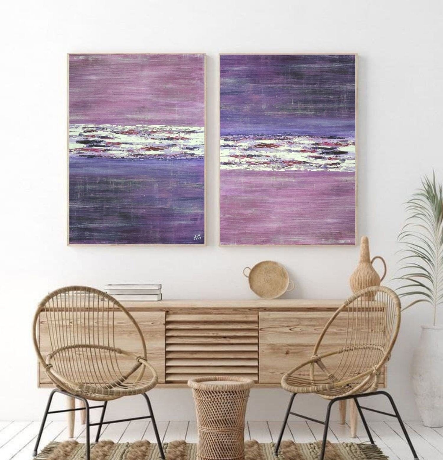 Large Painting, Oversize Set of 2 Abstract Wall Art Living Room Modern Pink Art Canvas, Original Painting, Contemporary Purple Art Entryway