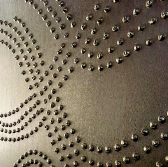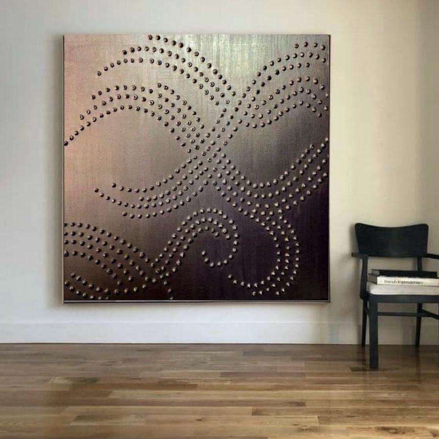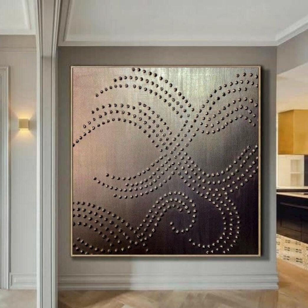 This original handmade artwork is a sculptural plaster painting featuring layered textures, rhythmic curves, and tactile dot patterns. The black metallic , black pearl palette brings warmth, light, and balance, making the piece timeless and easy to integrate into refined interiors.