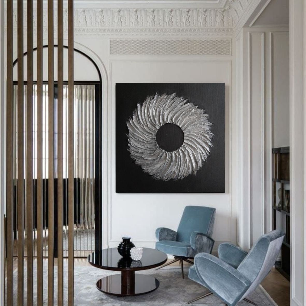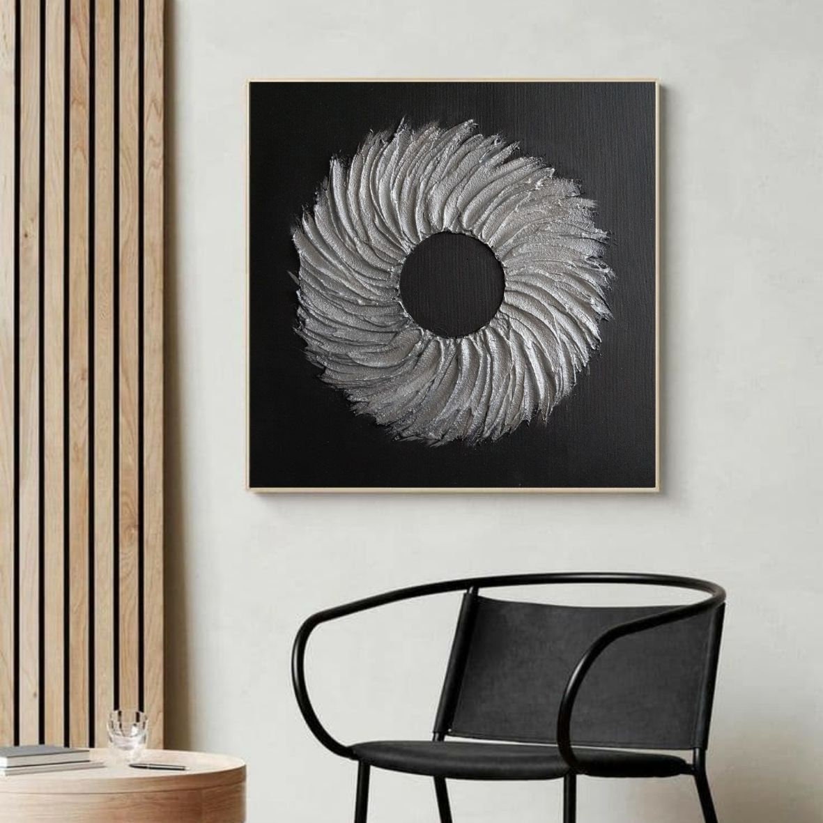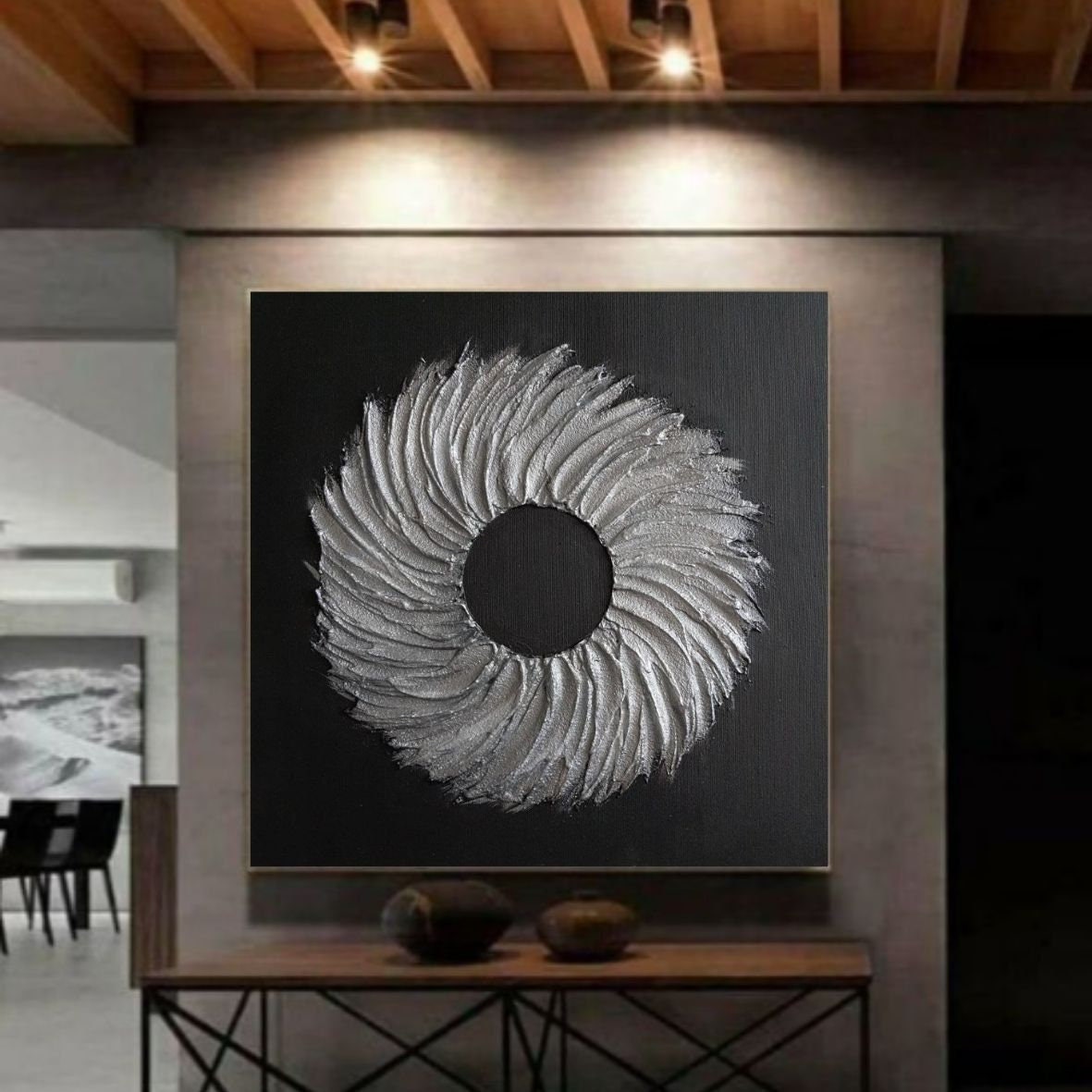 Large Silver Texture Wreath Painting: Modern Hallway Canvas Wall Art