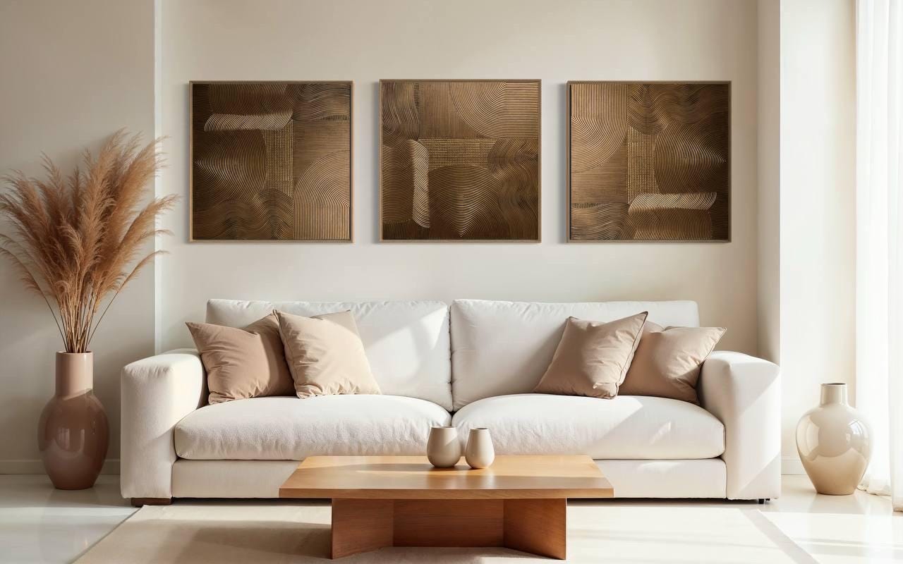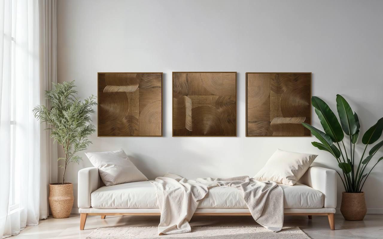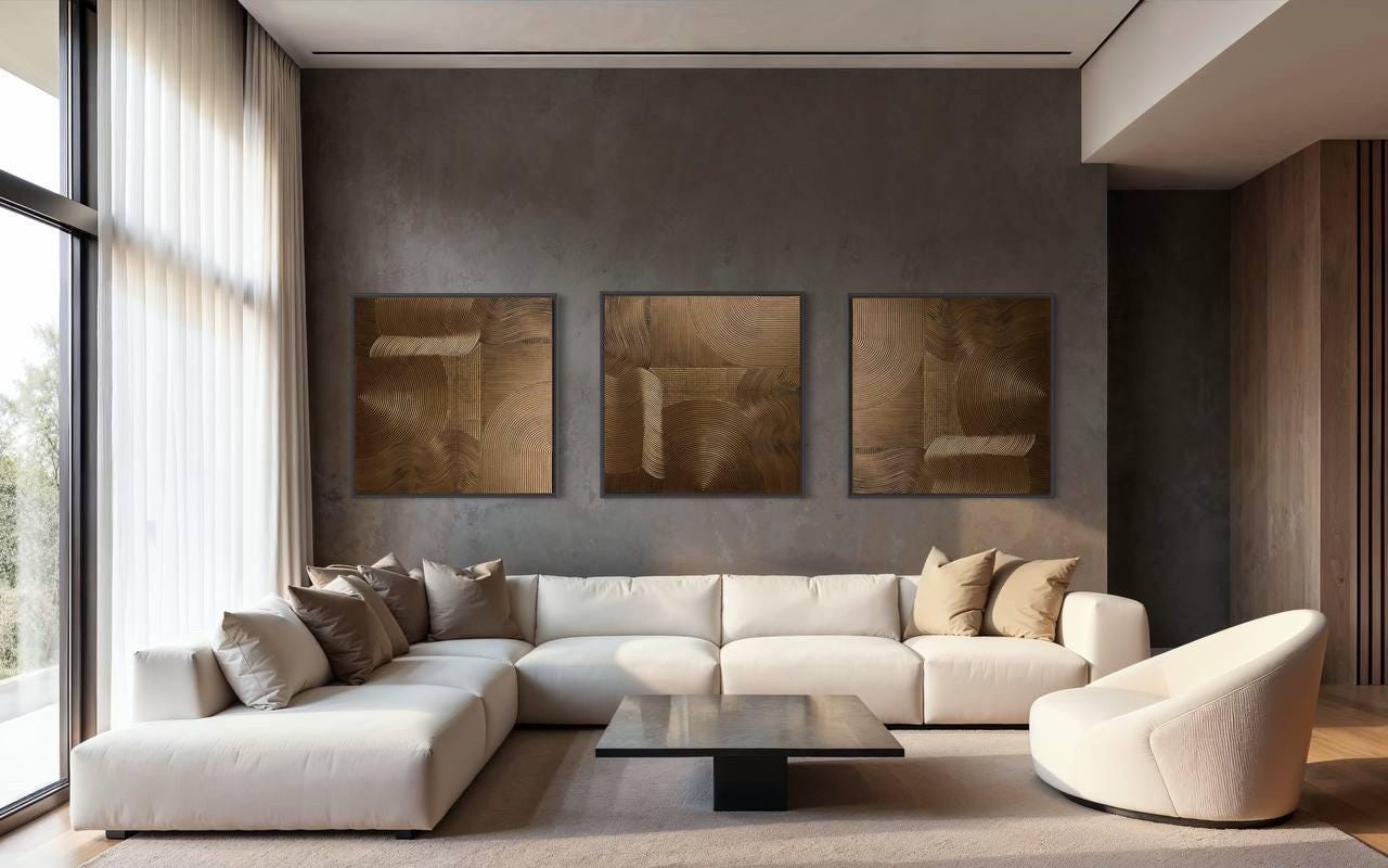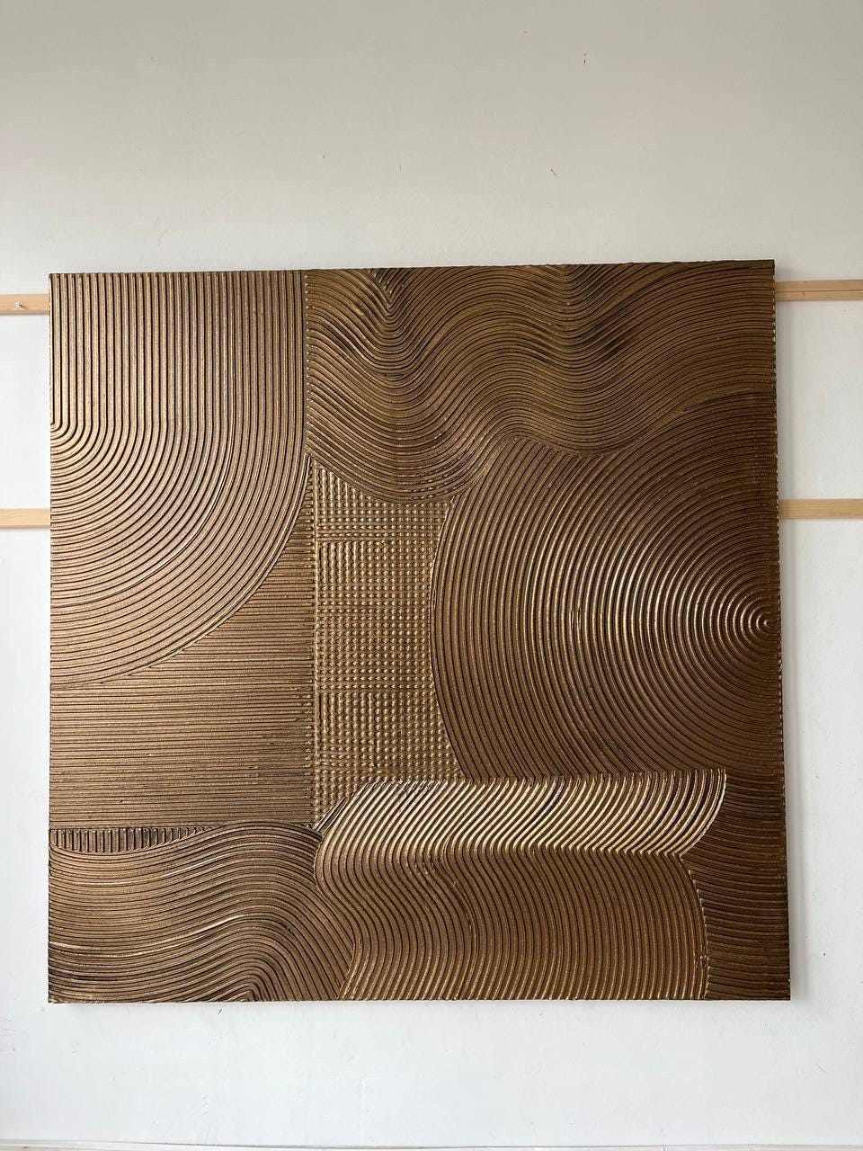 Elevate your interior with this stunning set of 3 textured golden bronze wall art panels, handcrafted to bring depth, luxury, and modern sophistication into your home. These large abstract paintings feature intricate geometric patterns, raised texture, and rich metallic gold tones that shift beautifully in the light. Perfect for anyone who loves modern decor, contemporary wall art, and luxury home styling, this triptych instantly transforms any room into a refined and elegant space.