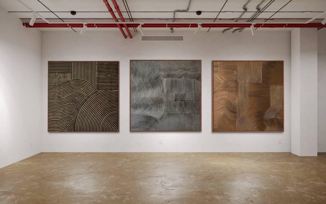 Extra Large Set of 3 Abstract 3d textured Wall Art Oversize Silver Bronze Black Plaster 3d lines Paintings Modern shiny Original Home Art Decor Canvas