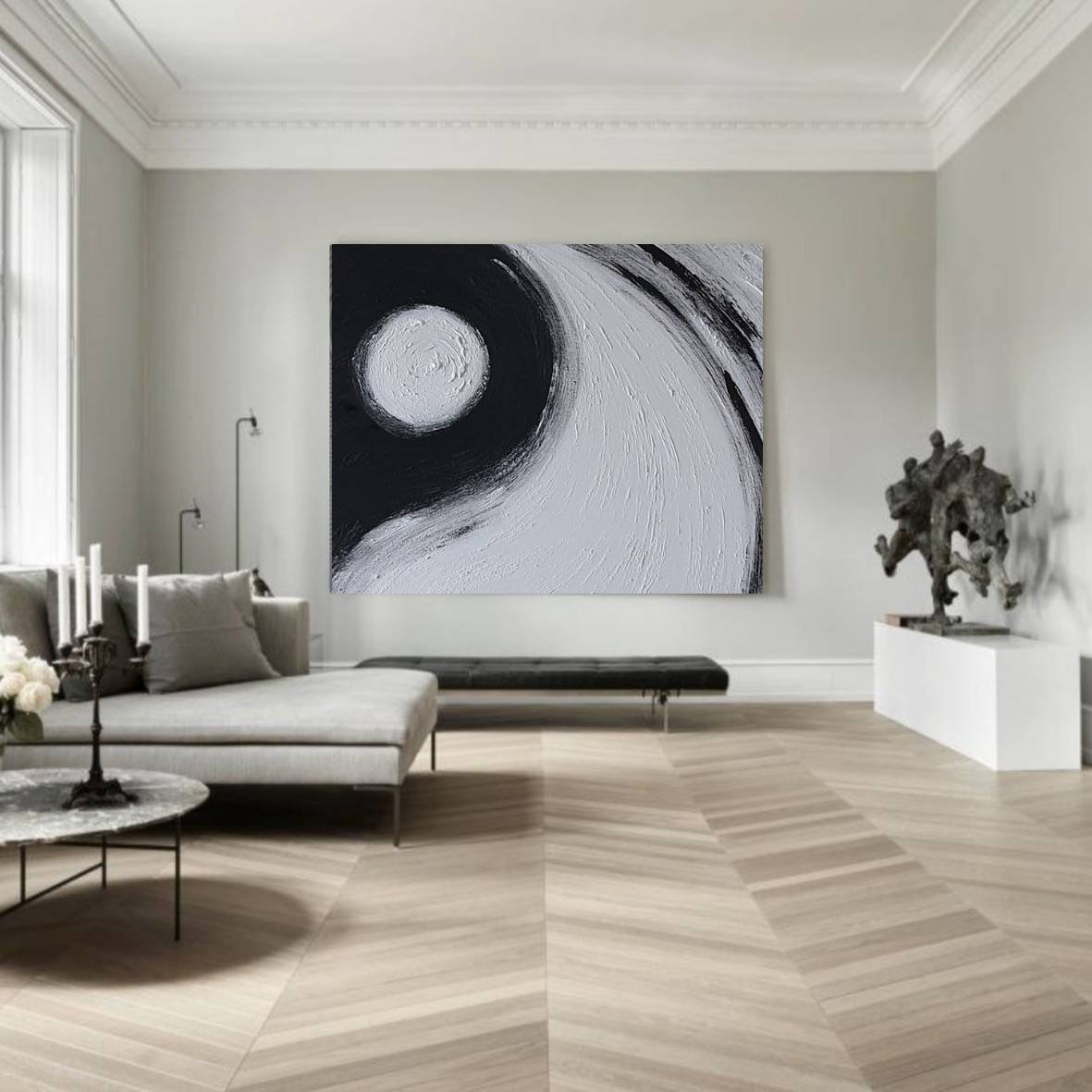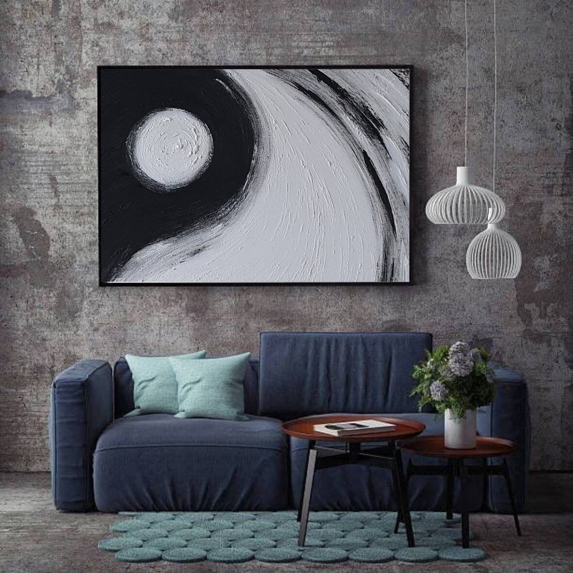 The dynamic contrast of black and white, combined with expressive circular movement, brings balance, depth, and sophistication to any modern interior.