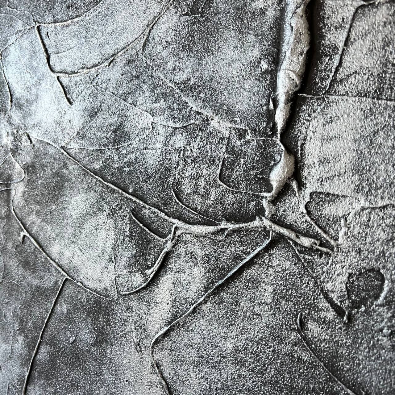 This original artwork features dynamic layered texture with metallic silver highlights over a deep black background. The combination of matte and reflective surfaces creates a powerful yet sophisticated look that shifts beautifully with changing light.