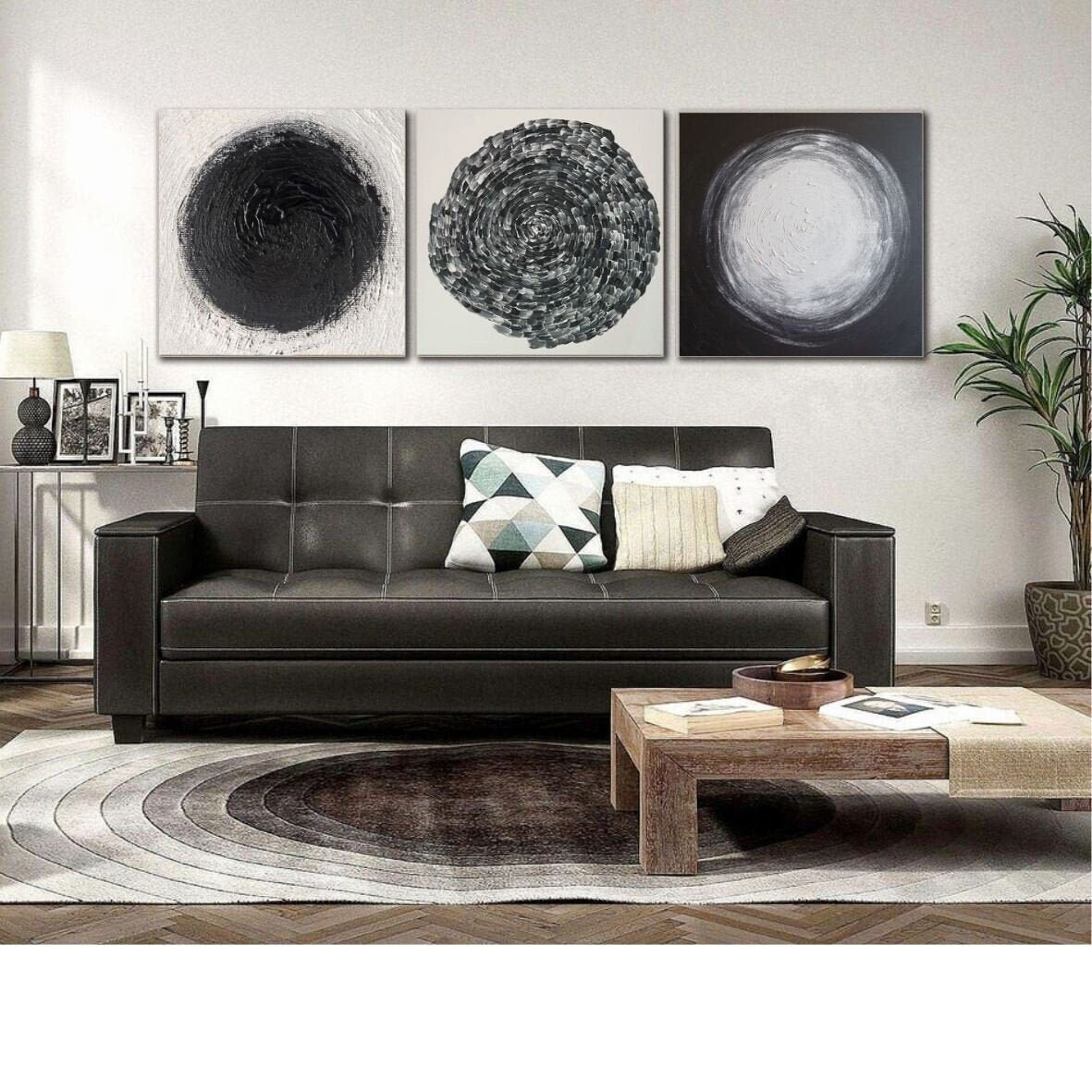Large Painting Oversize Set 3 Black White Abstract Wall Art Modern Wall Decor Point Canvas Original Painting Circle Contemporary Art Office