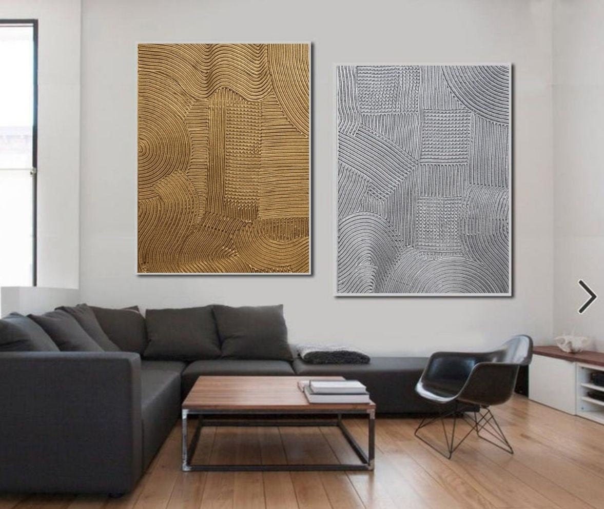 Large Gold Silver Texture 3d Painting Set of 2 Abstract Wall Art Living Room Modern Canvas Original Painting Contemporary Shine Art Hallway