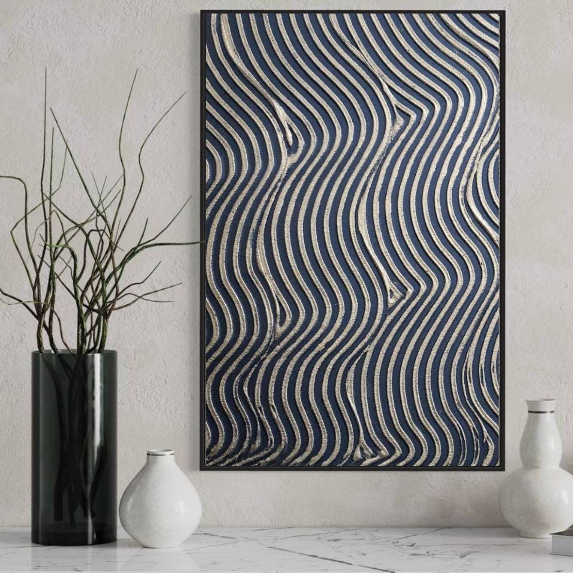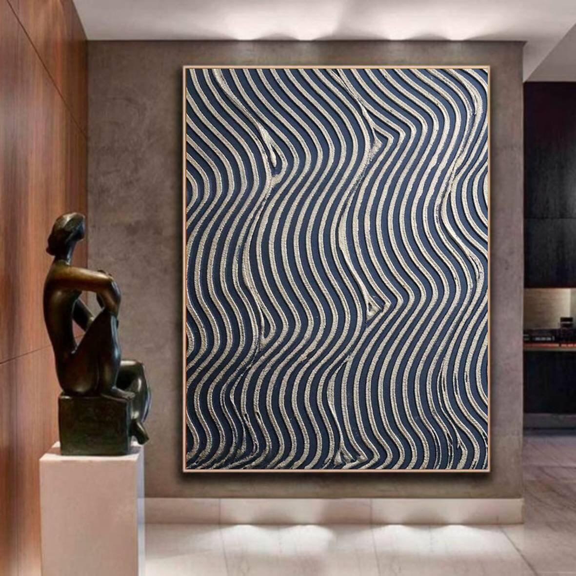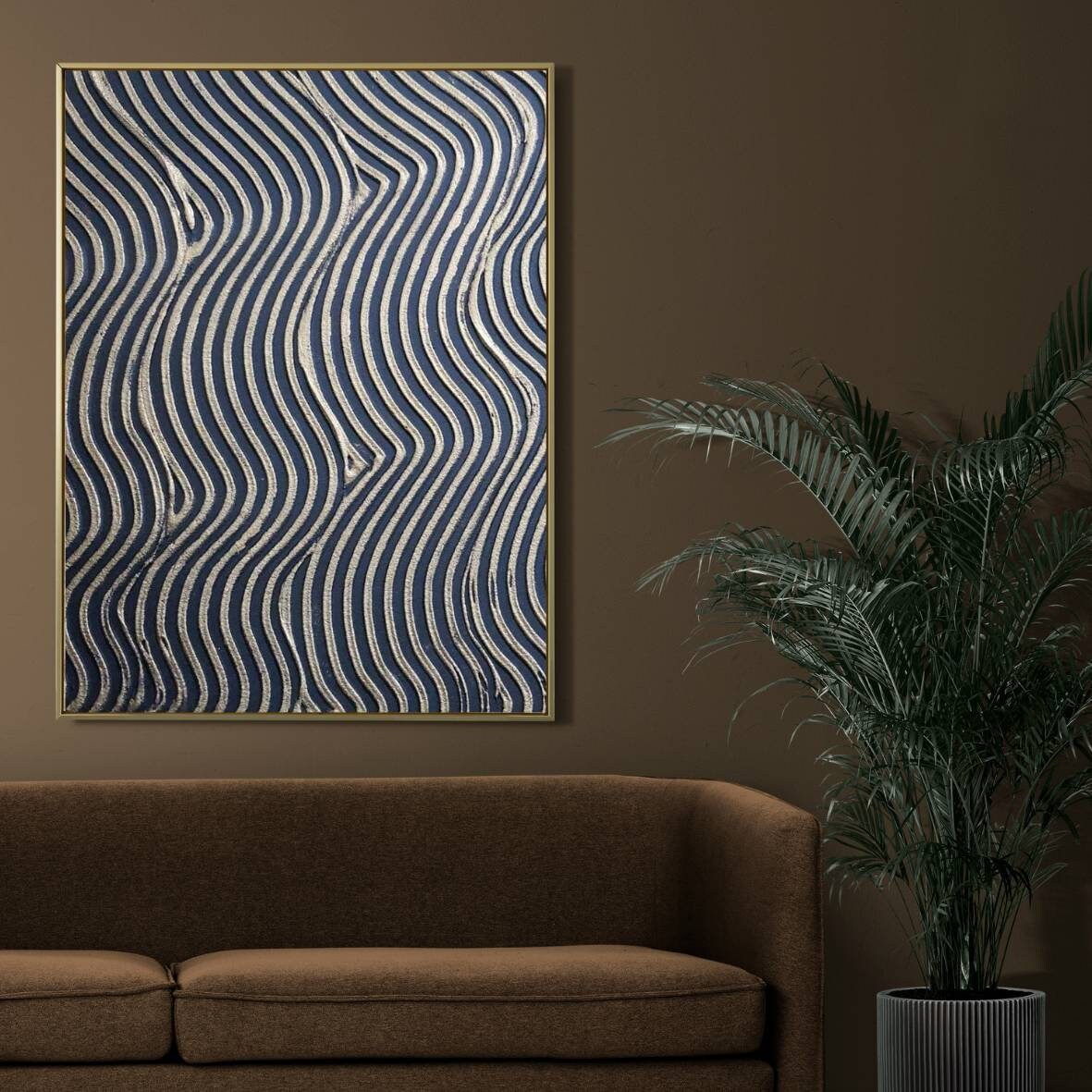 The painting’s warm metallic tones and minimal geometric texture make it a perfect fit for modern, luxury, or neutral interiors — ideal for your living room, bedroom, hallway, or office.
