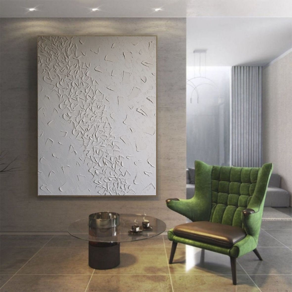 The painting’s white tone and minimal 3d texture make it a perfect fit for modern, luxury, or neutral interiors — ideal for your living room, bedroom, hallway, or office.