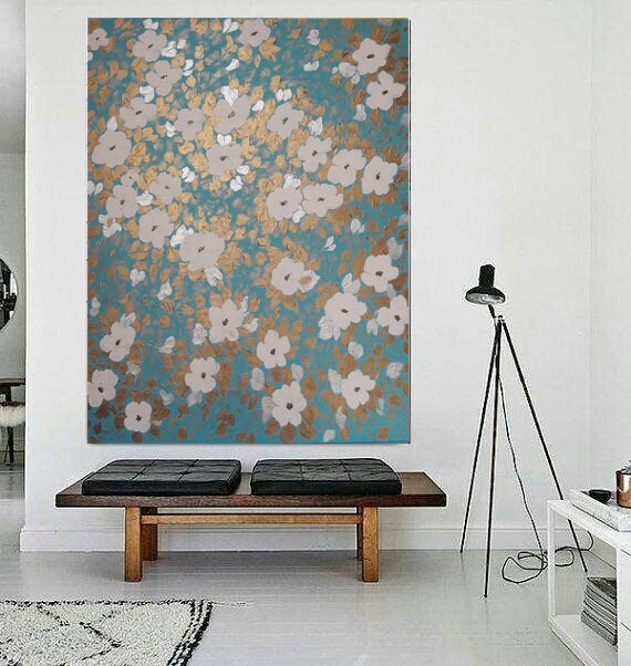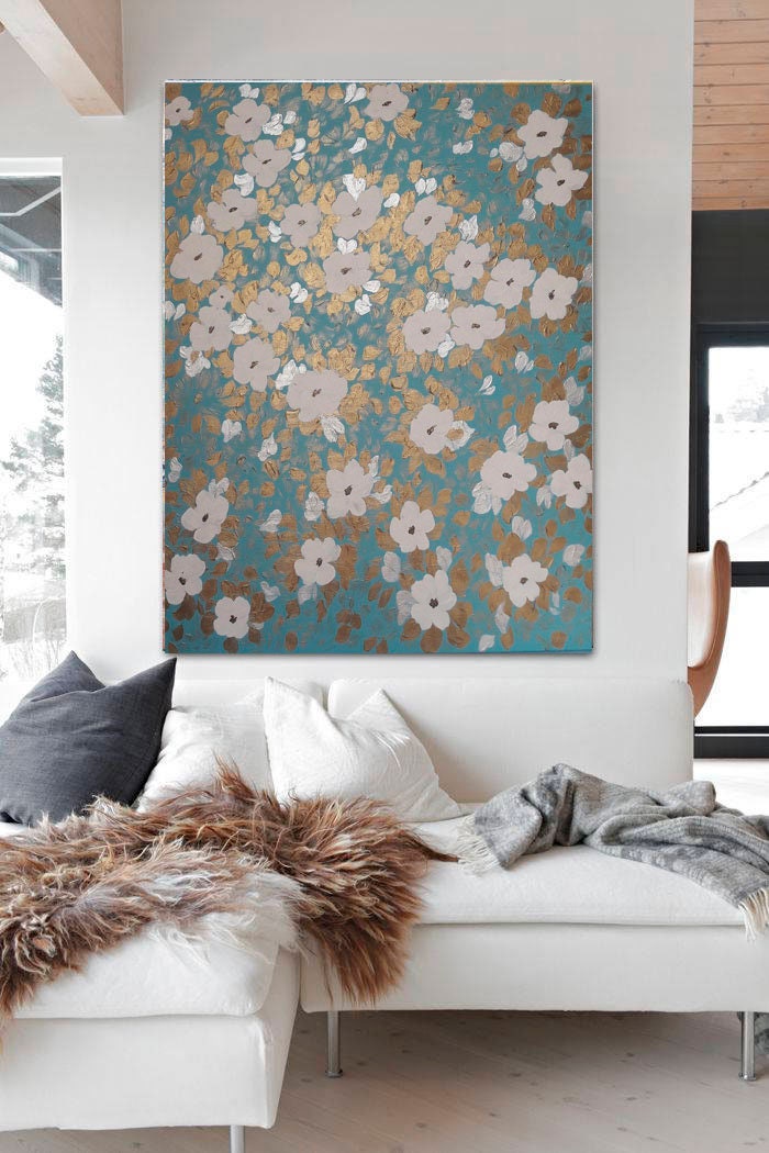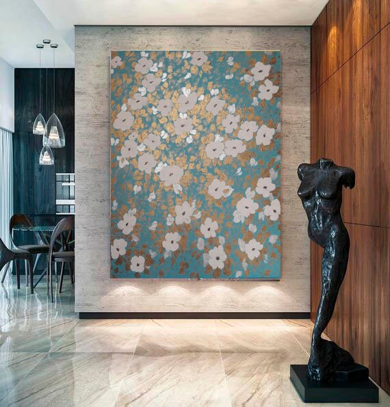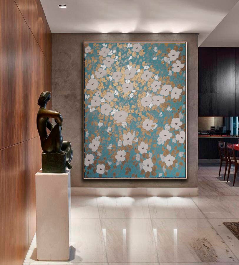 Large White Flowers Painting Gold Silver Leaves Oversize Abstract Living Room Wall Art Modern Original Painting Canvas Contemporary Wall Art