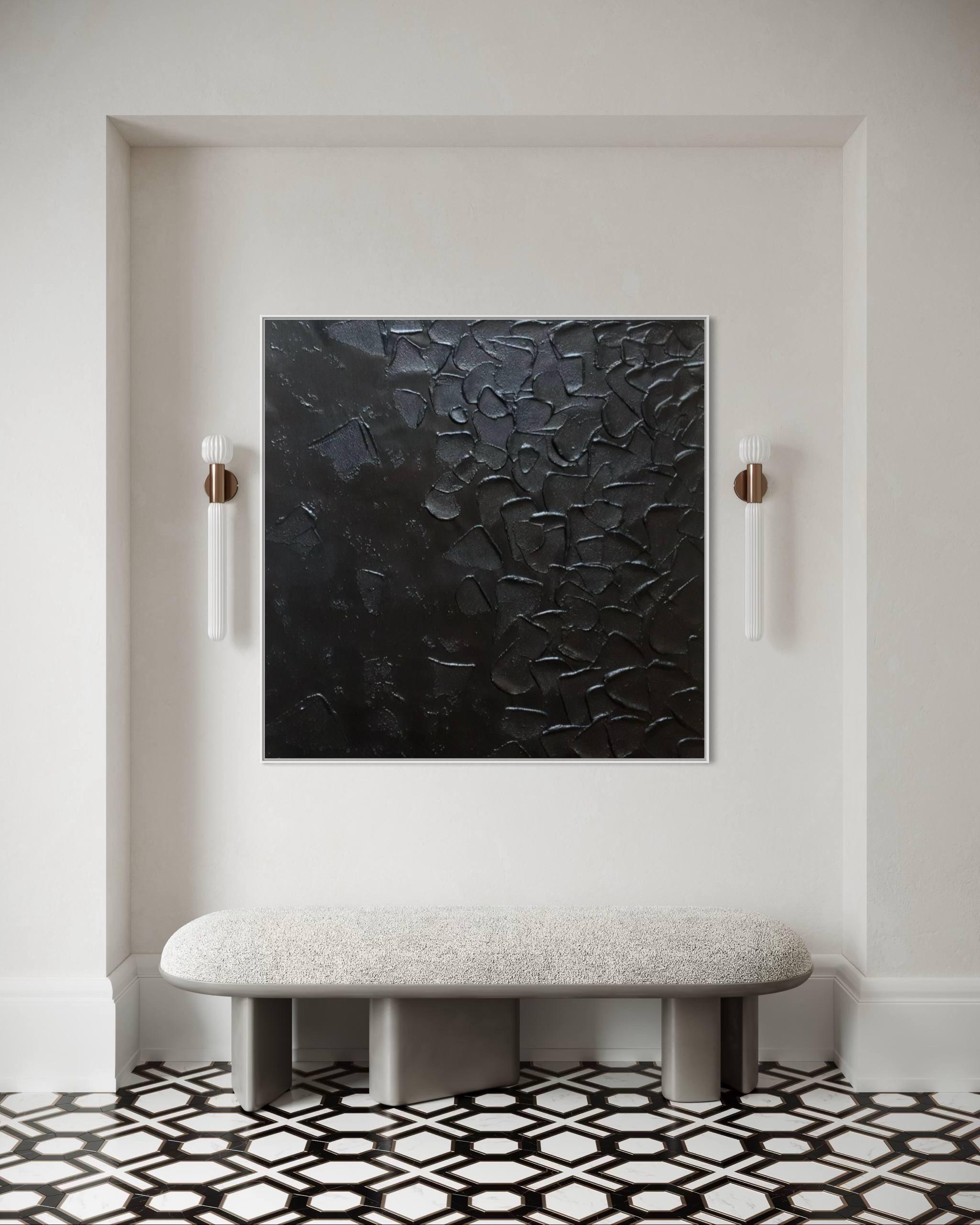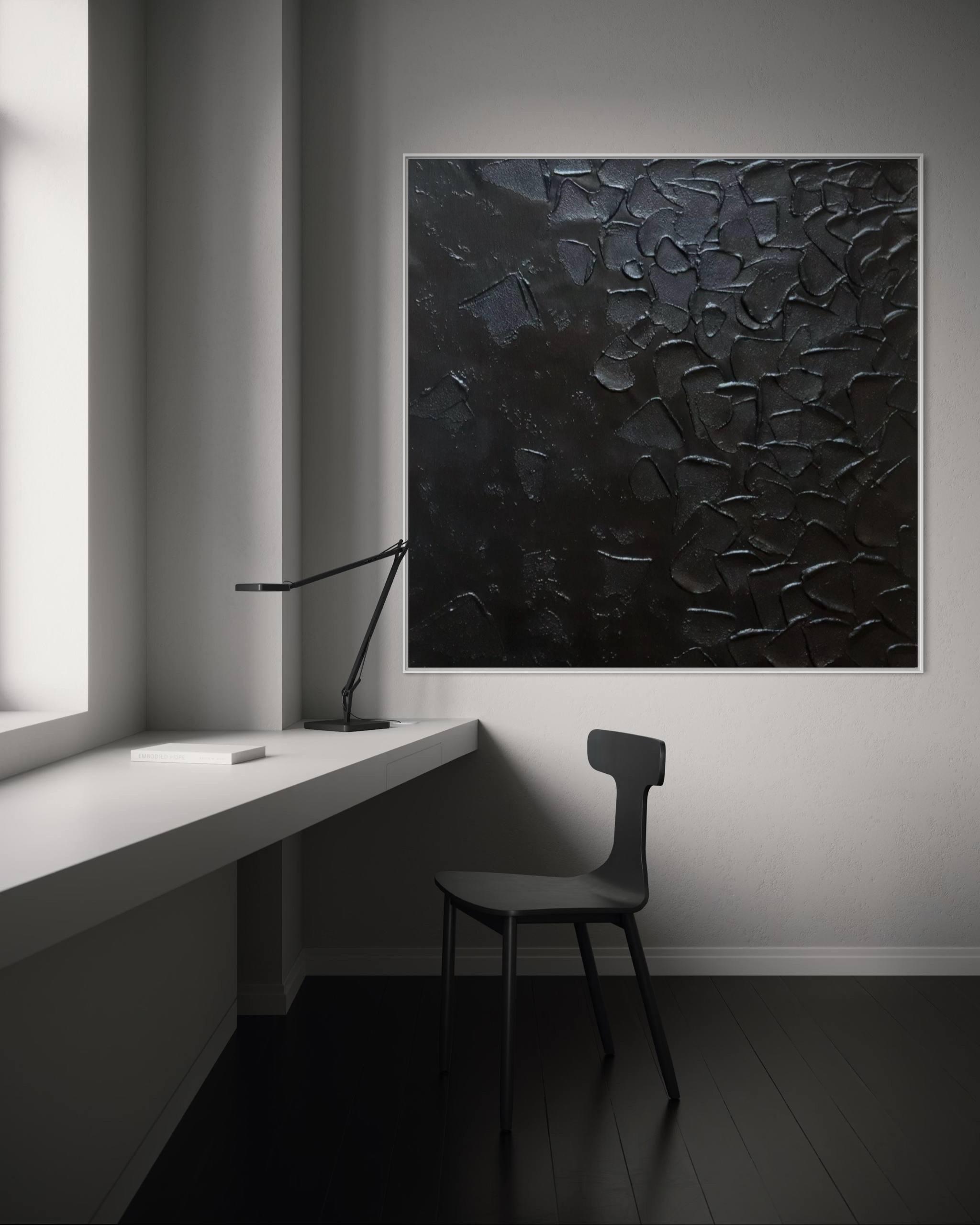 This large black textured abstract painting is a bold, sculptural statement piece, entirely handmade using layered texture techniques to create a deep 3D relief surface.