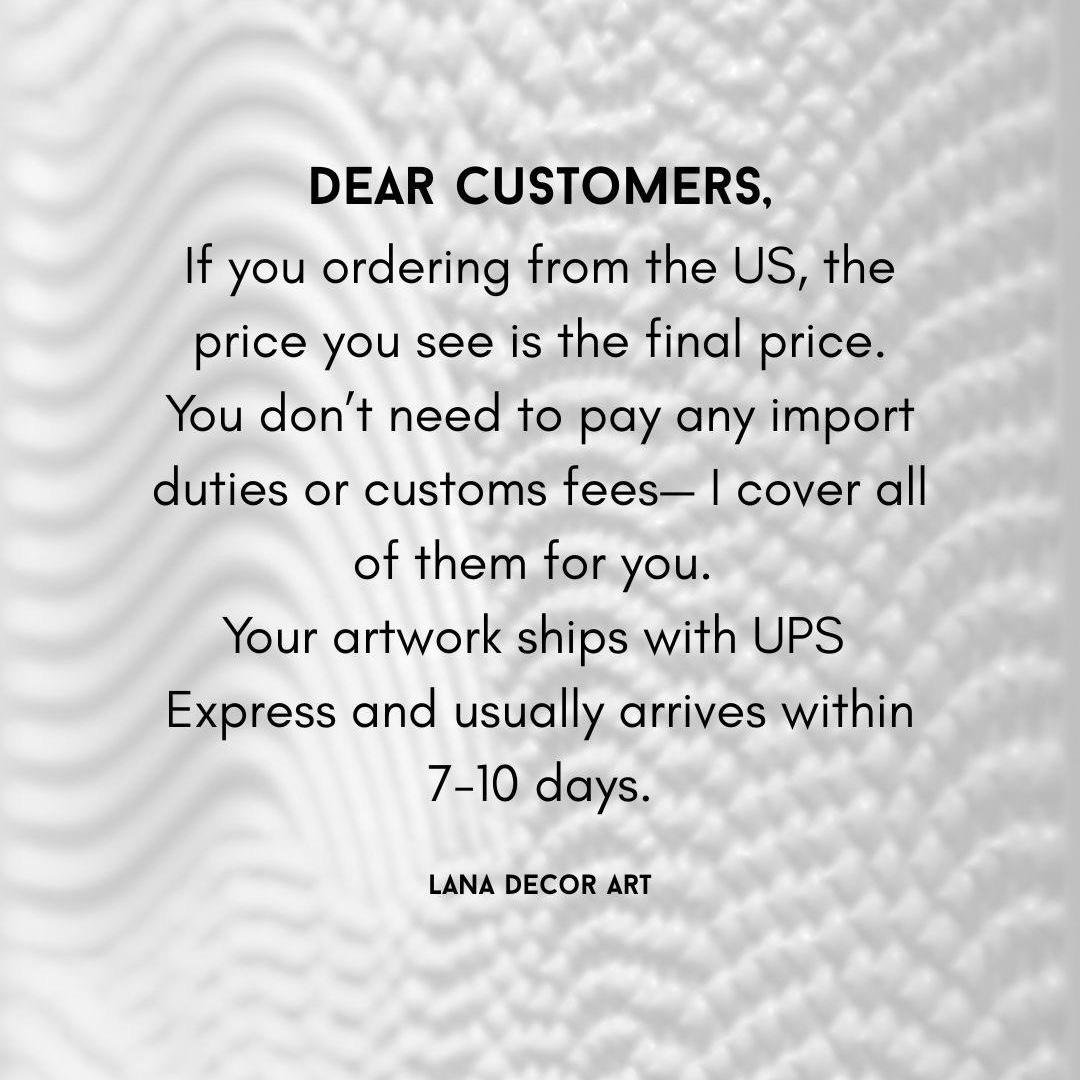 IMPORTANT: If you receive a damaged painting you must save the damaged box and damaged painting so I can immediately file a claim with the shipping company. They will need to see the box & painting to launch their investigation. All of my paintings are fully insured.