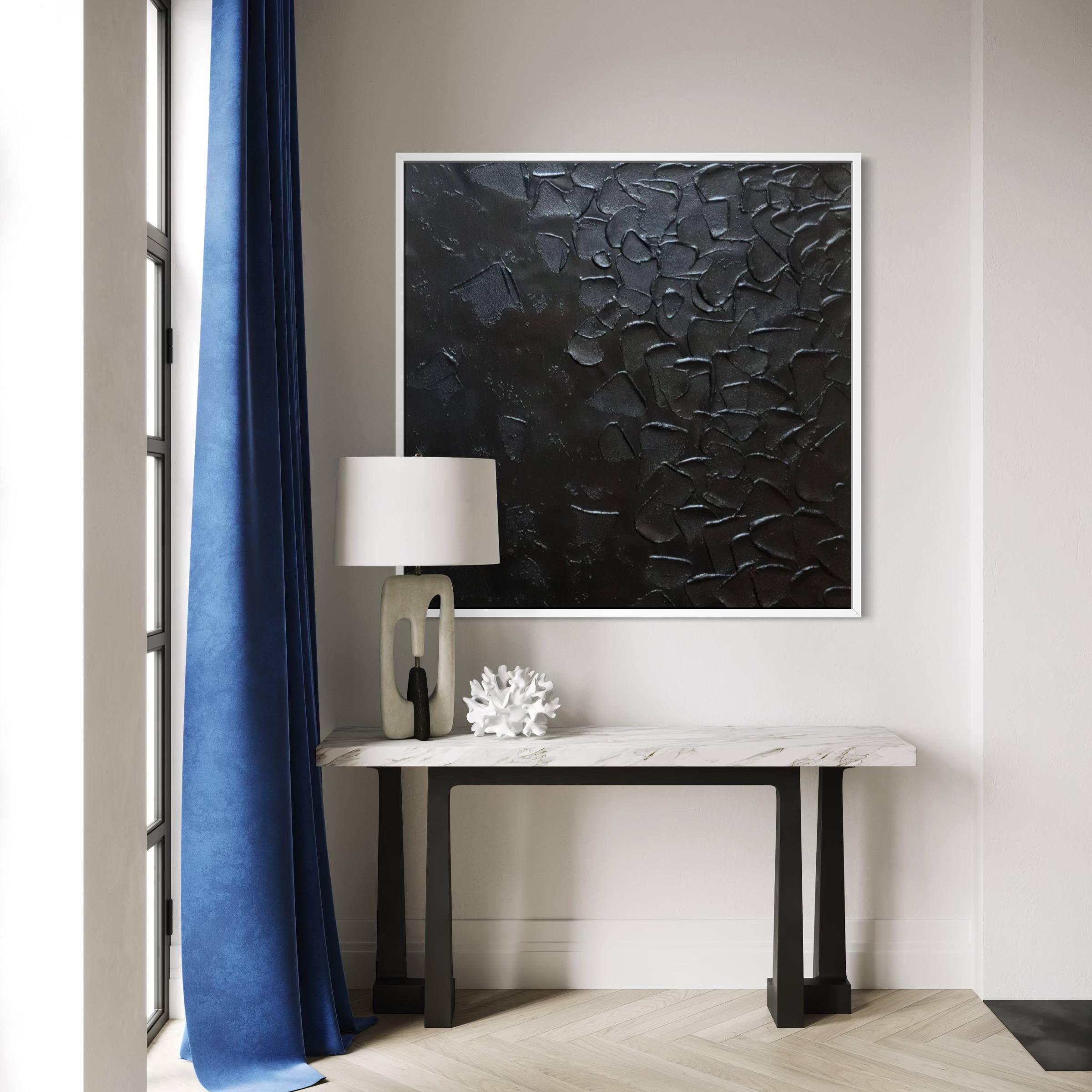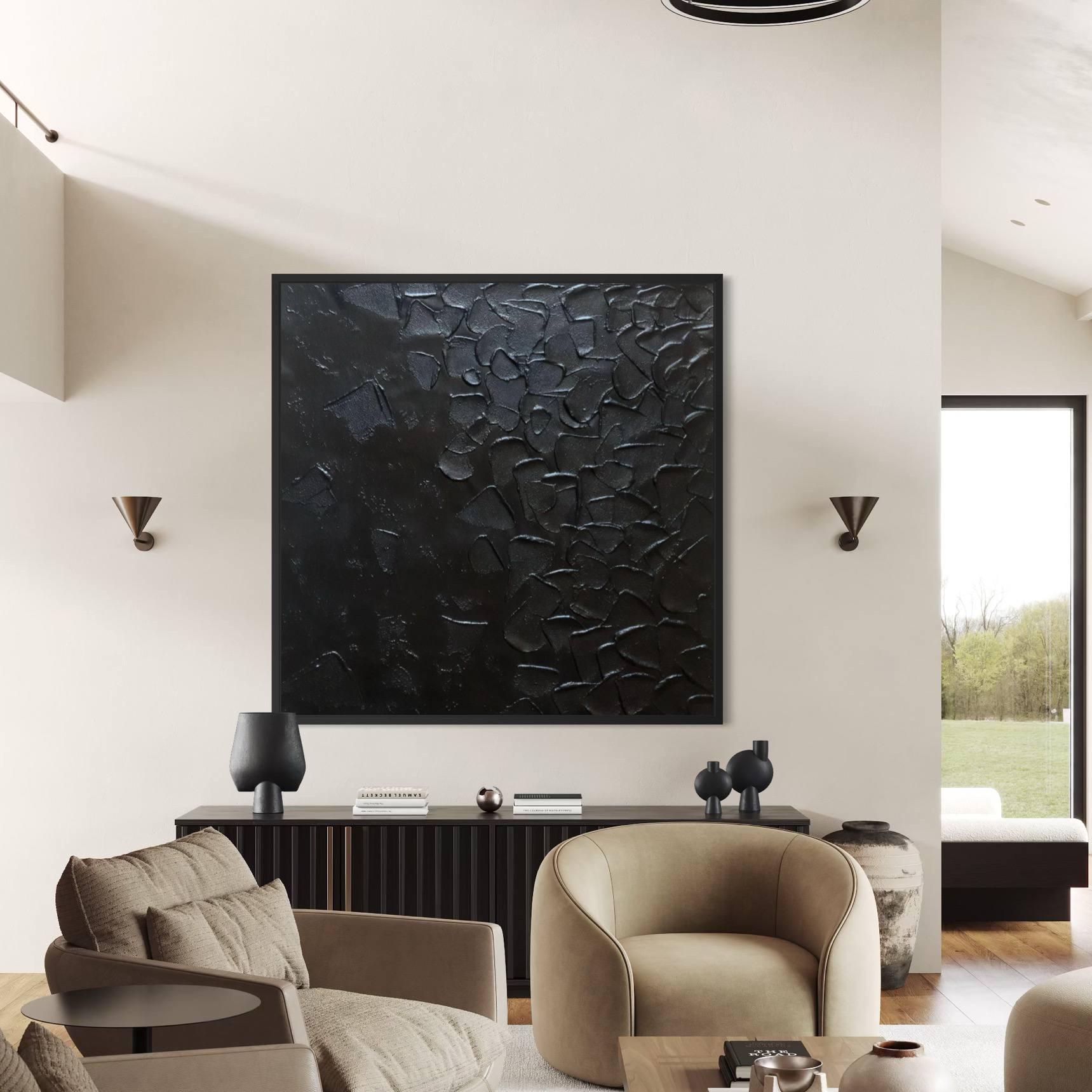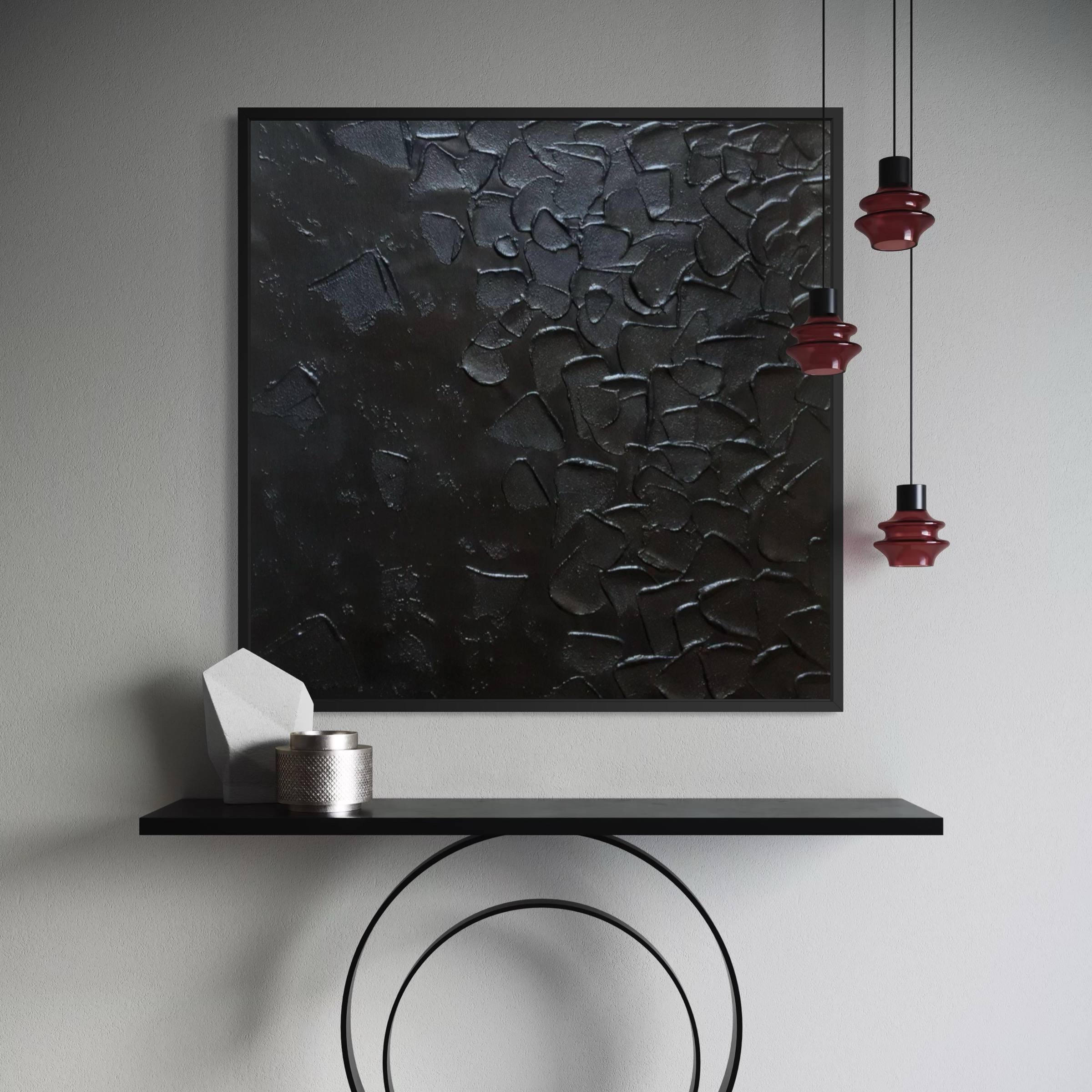 This large black textured abstract painting is a bold, sculptural statement piece, entirely handmade using layered texture techniques to create a deep 3D relief surface.