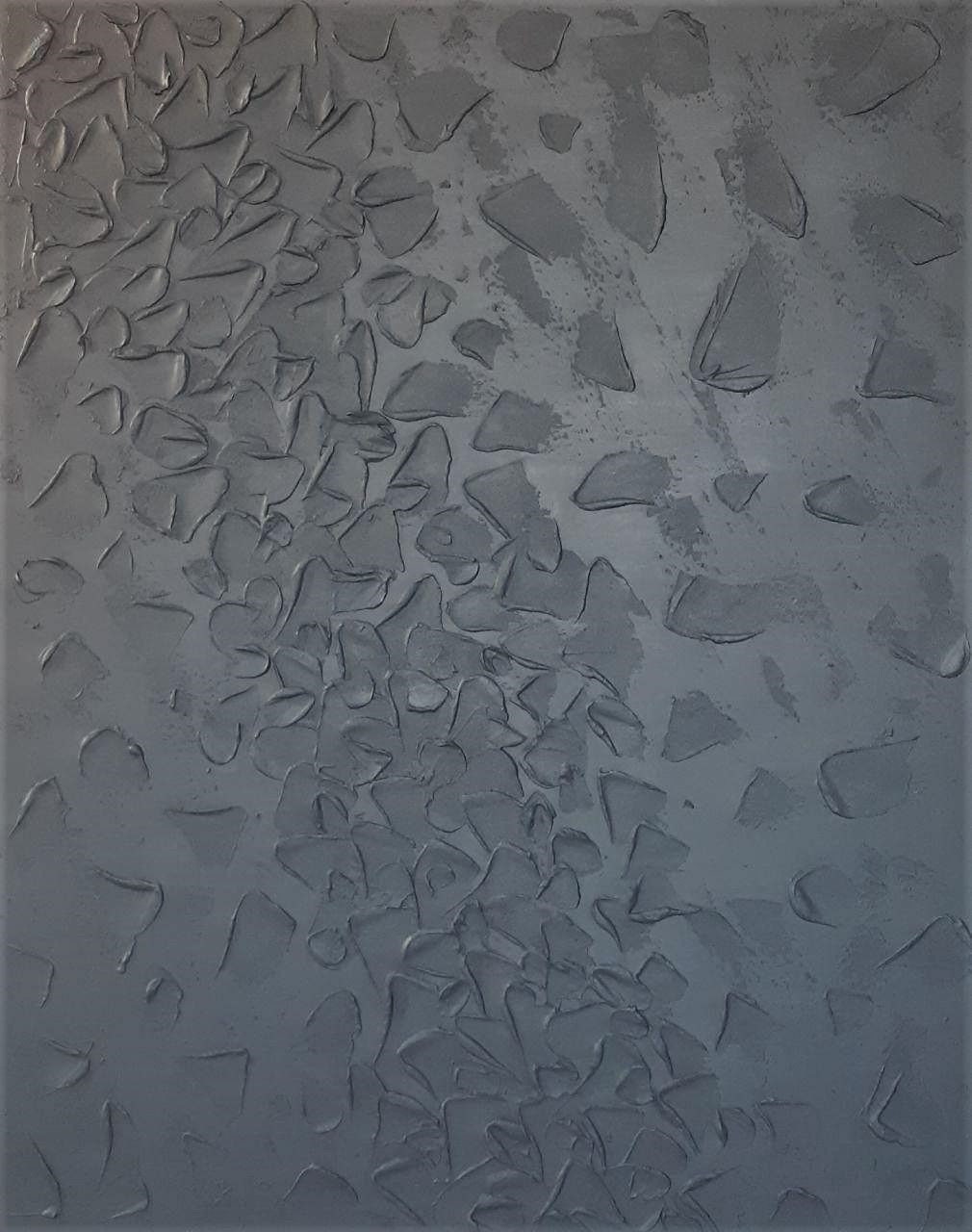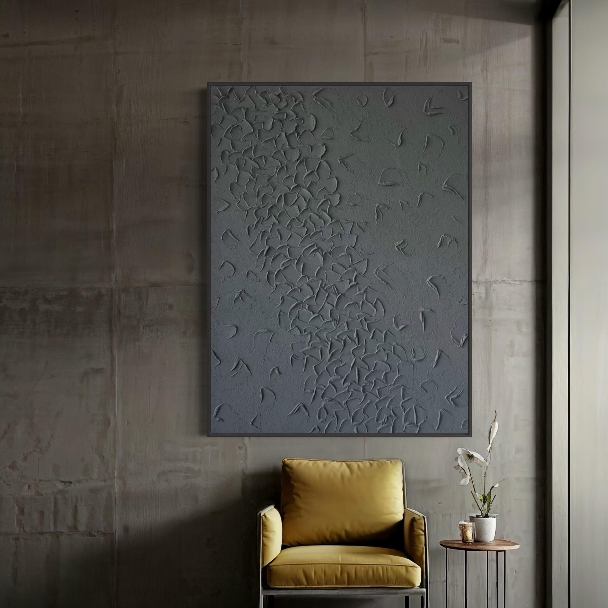 This large gray textured abstract painting is a bold, sculptural statement piece, entirely handmade using layered texture techniques to create a deep 3D relief surface.