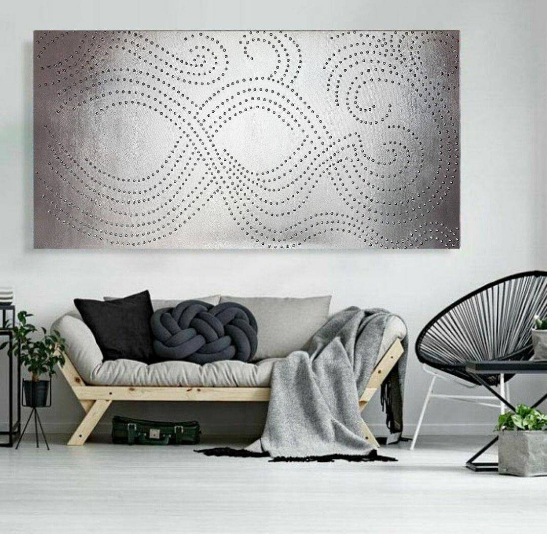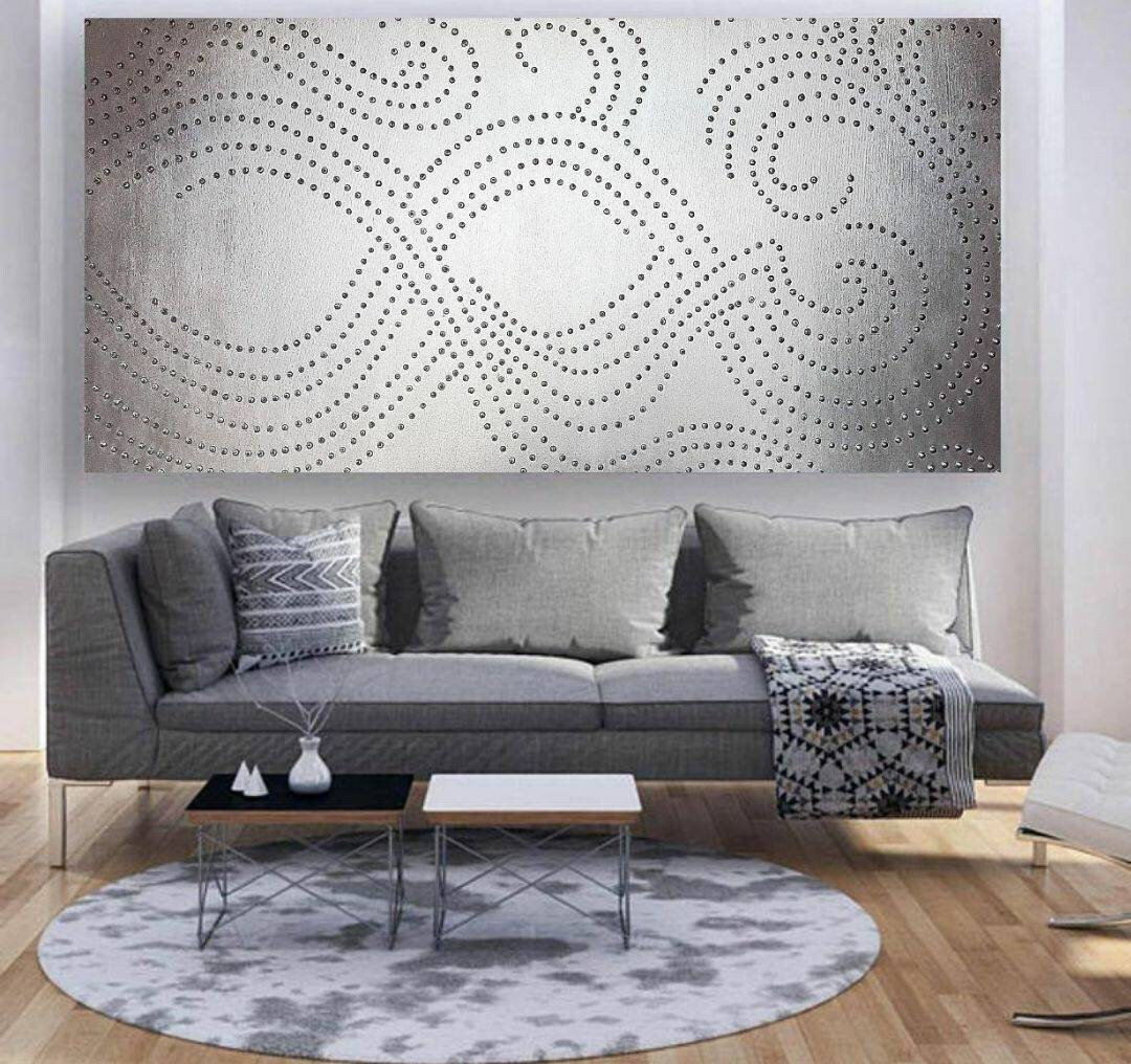 Large Silver Abstract Painting: 3D Dot Textured Wall Art