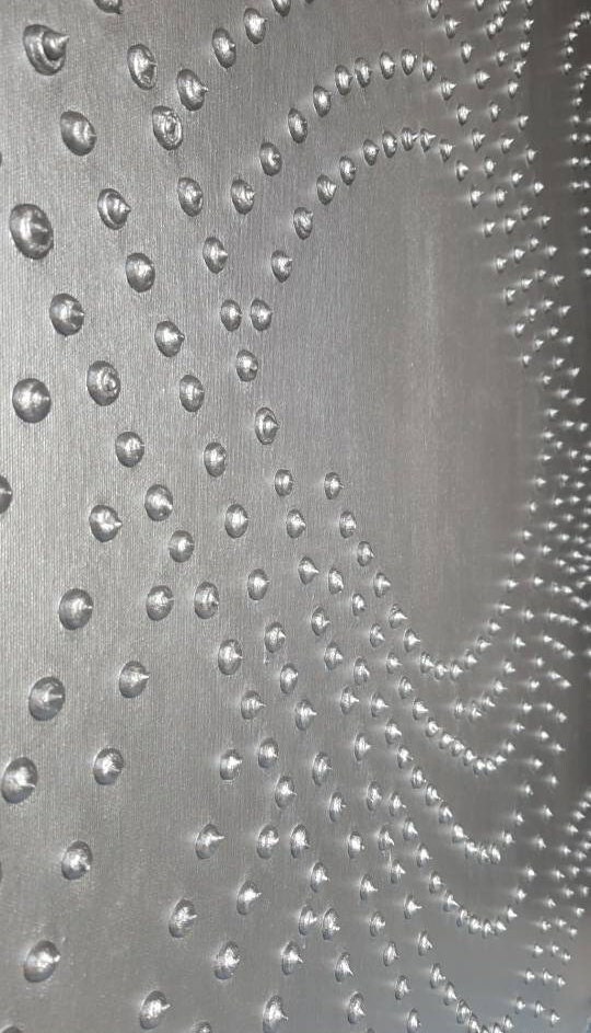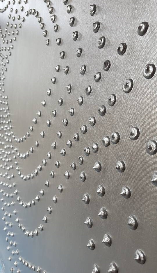 Large textured abstract wall art in silver color, created with sculptural plaster and raised 3D dots.