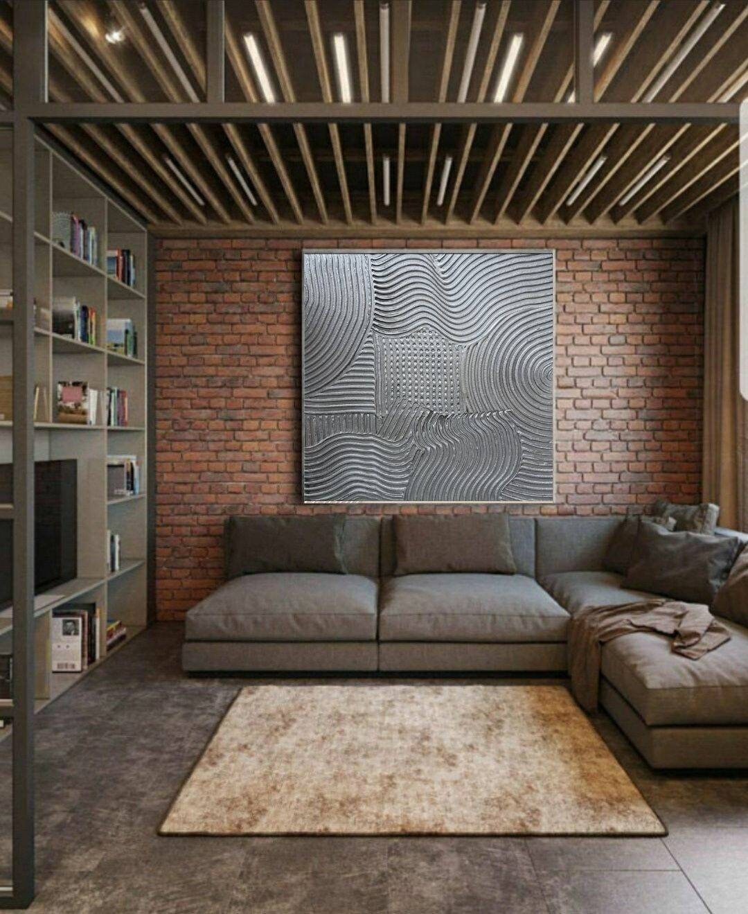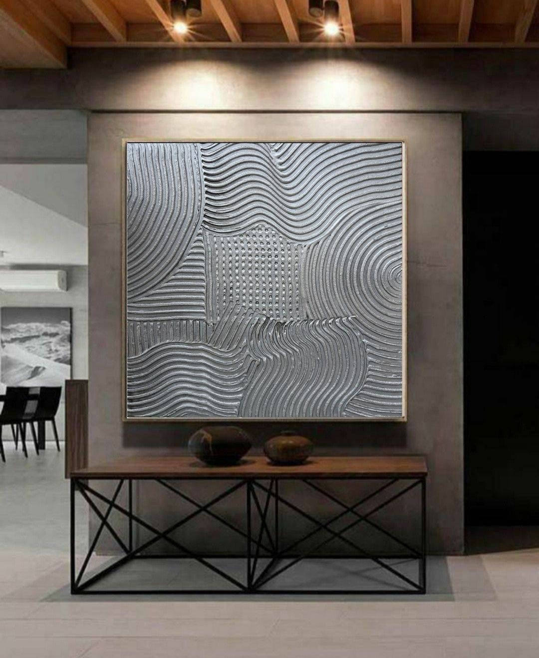 Extra Large 3d Textured wall art silver with patina Abstract painting volumetric picture Hallway Original Oversized 3d plaster Canvas piece
